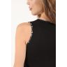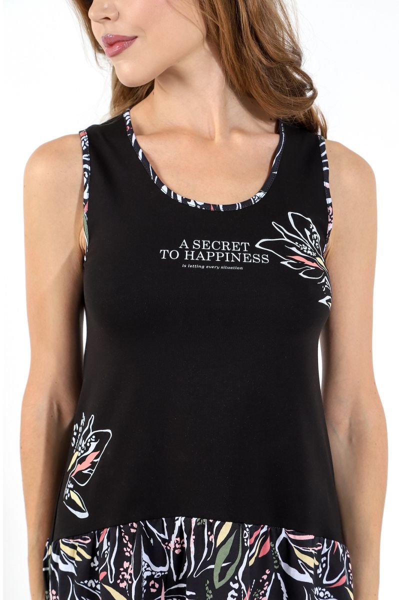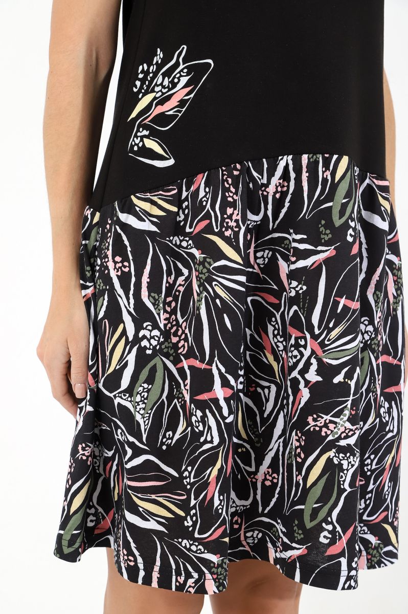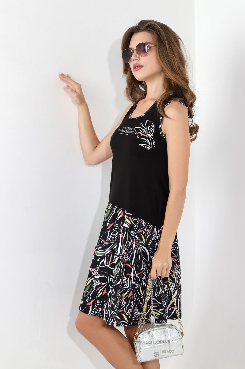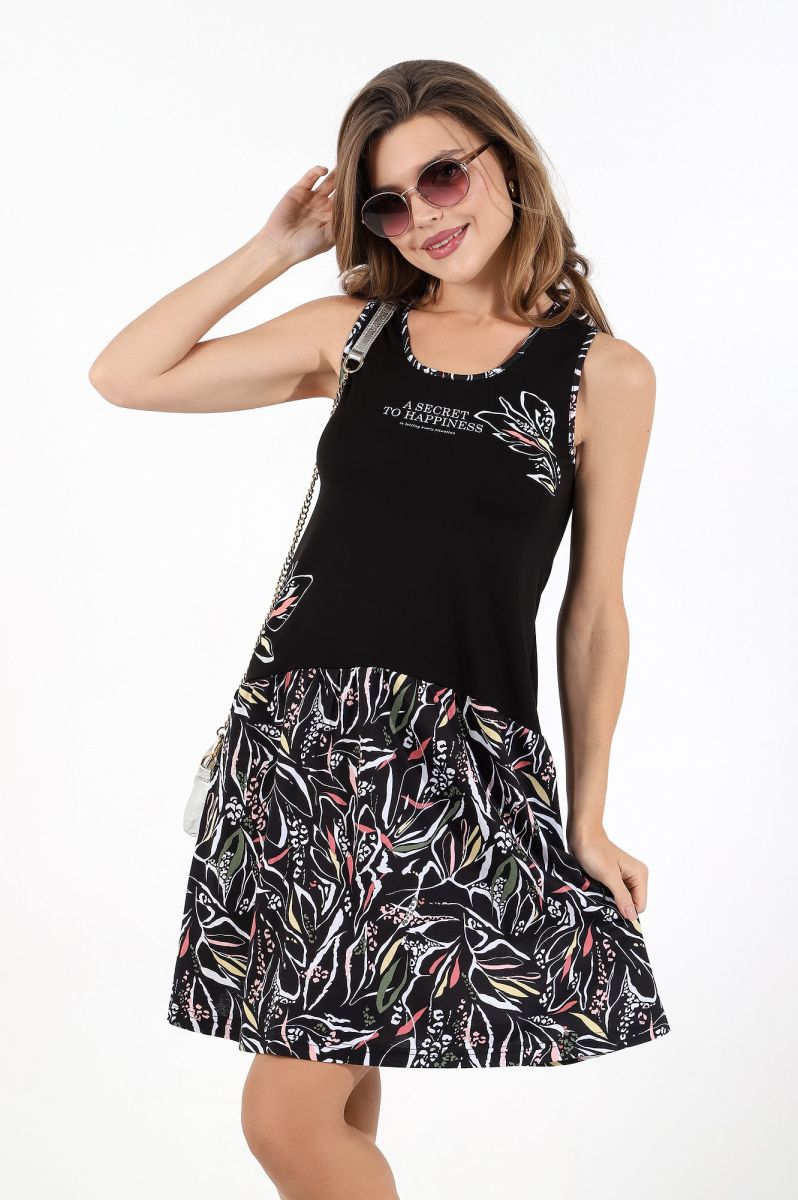 Сарафан молодежный полуприлегающего силуэта из трикотажного полотна «кулирка» в комбинации двух видов: гладкокрашенного и с набивным рисунком. Нижняя отрезная часть изделия присборена по шву соединения с лифом. Горловина и проймы окантованы контрастным материалом, на полочке принт выполненный в технике «шелкография».