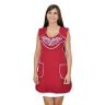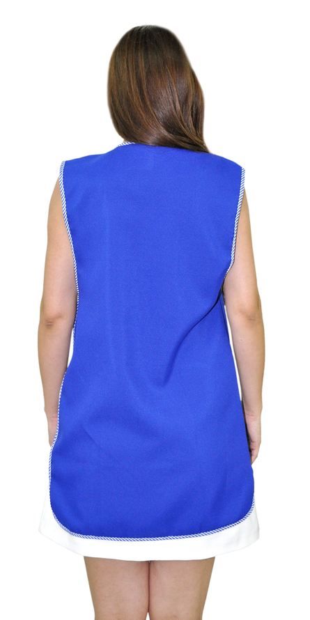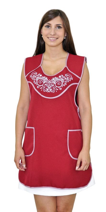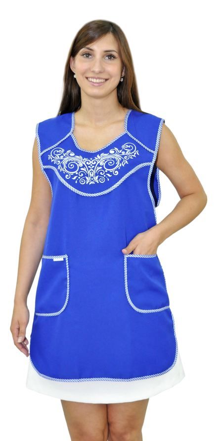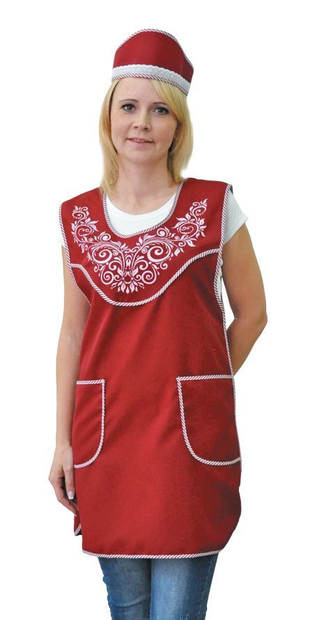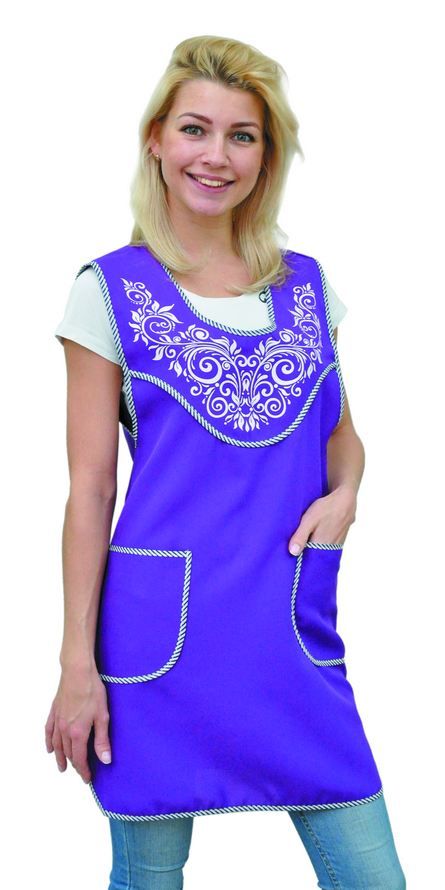 Сарафан женский укороченный расклешенного силуэта с боковой застежкой на молнию и двумя нижними накладными карманами. Полочка с круглым вырезом, отрезной фигурной кокеткой с печатным узором, нанесенным методом шелкографии. Спинка без отделки, все срезы сарафана обработаны кантом из контрастной капроновой ткани. Сарафан предназначен для защиты от общепроизводственных загрязнений.