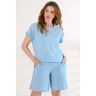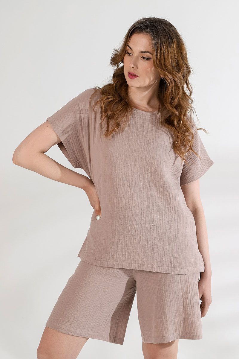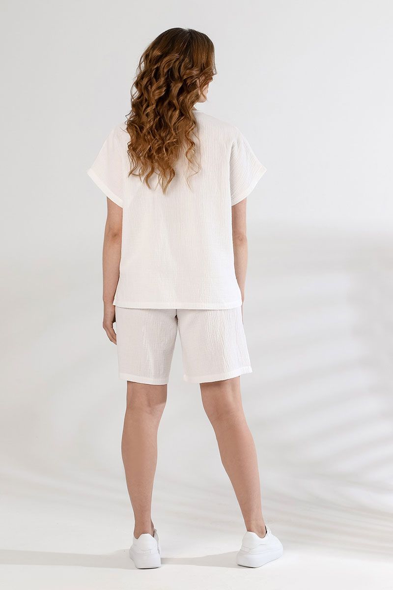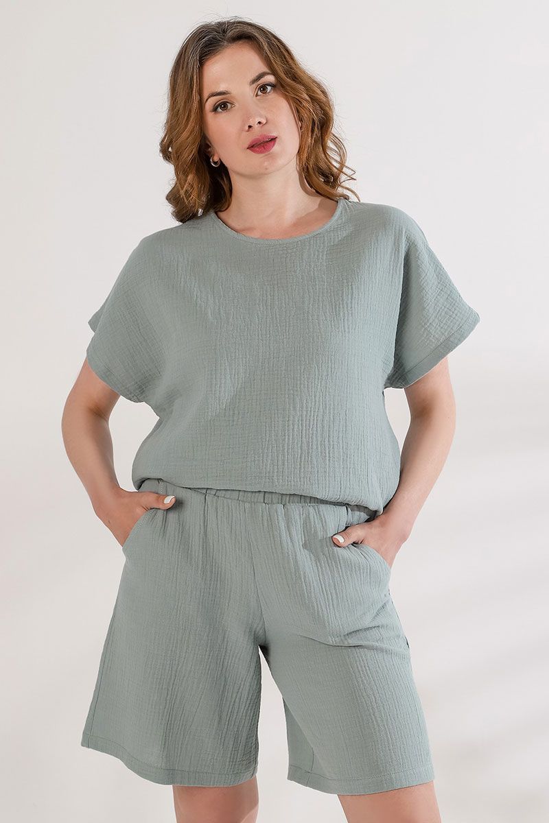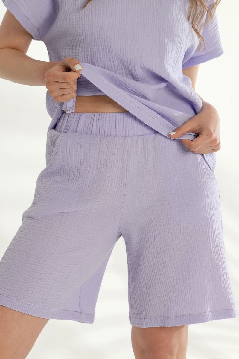 Шорты женские из гладкокрашеного тканого полотна «муслин», удлиненные, на притачном поясе с эластичной тесьмой внутри и карманами в боковых швах.