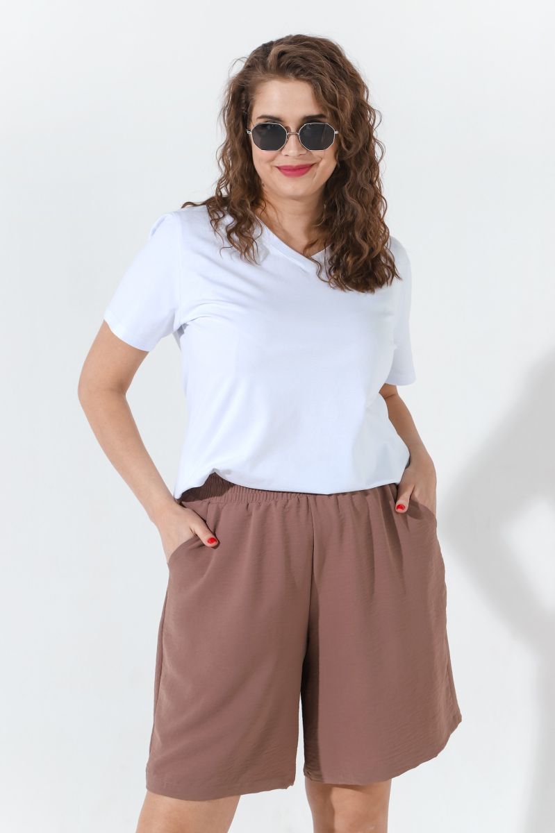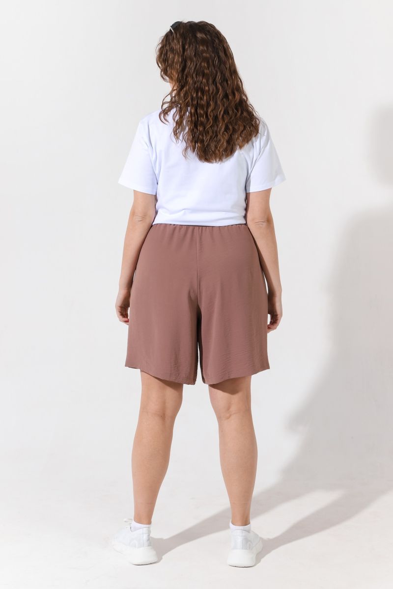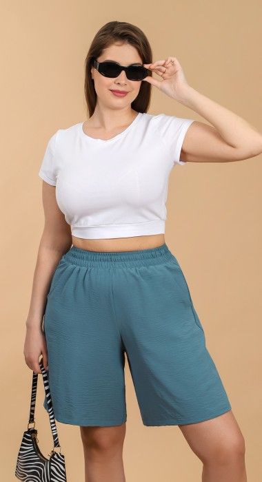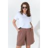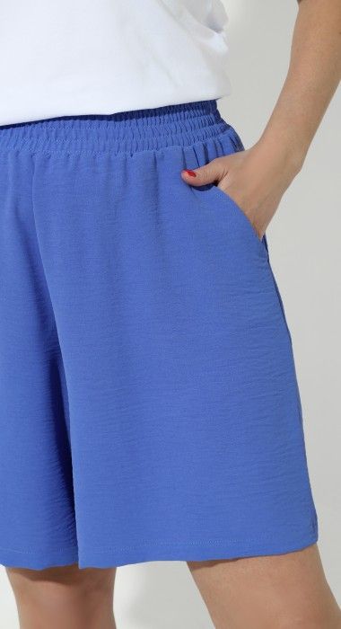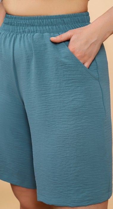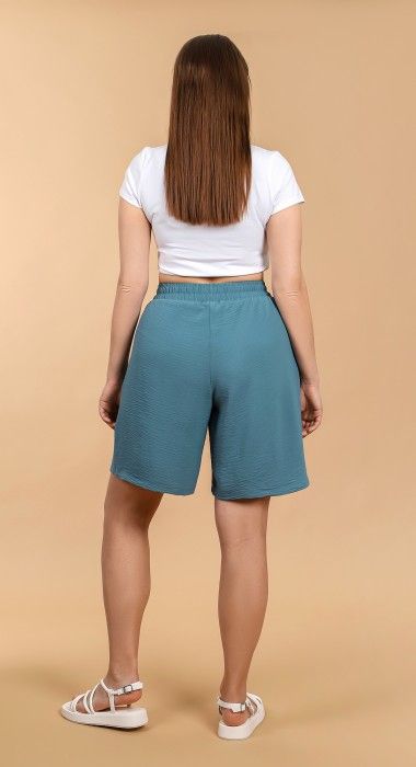 Шорты женские из тканого гладкокрашеного полотна «Лен Манго», свободного покроя средней длины, с карманами в боковых швах, на притачном поясе с эластичной тесьмой внутри. *Ткань Лен Манго является искусственным аналогом ткани из натурального состава и имеет схожие текстурные характеристики. Лен Манго имеет крэш-эффект - "эффект помятости", в отличие от натурального льна не требует тщательного разглаживания утюгом и практически не мнется при носке. Ткань тактильно приятная, лёгкая и прочная, садится по фигуре. Оптимальные показатели паропроводимости позволяют использовать Лен Манго для пошива летней одежды.
