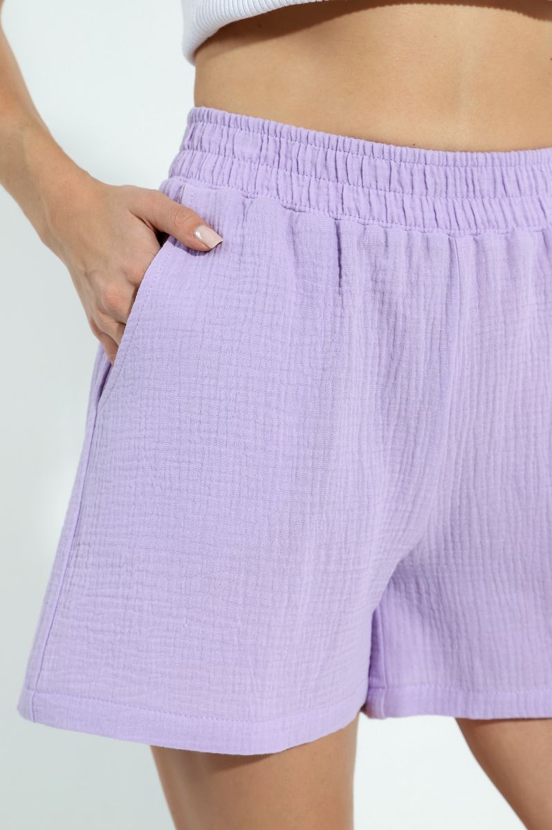 Шорты молодежные из гладкокрашеного тканого полотна «муслин», свободные, средней длины, на притачном поясе с эластичной тесьмой внутри, карманами в боковых швах.