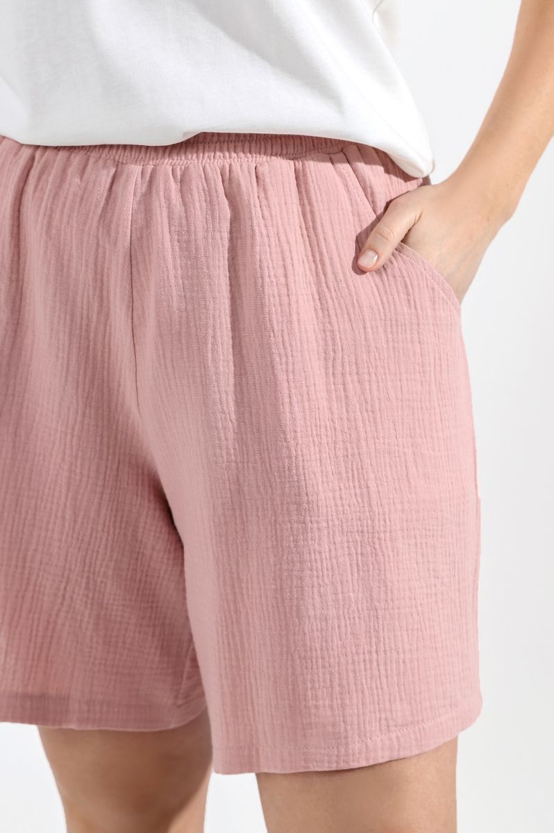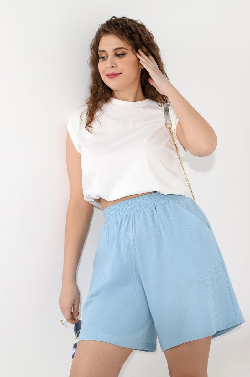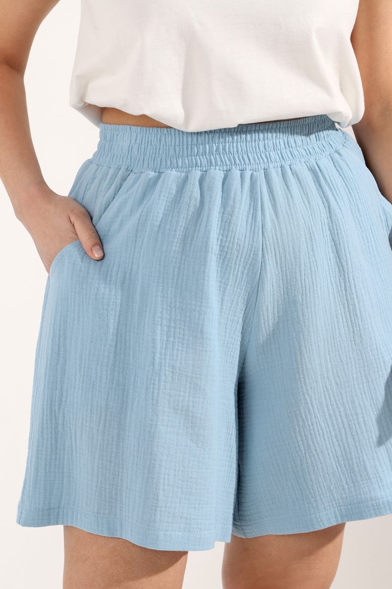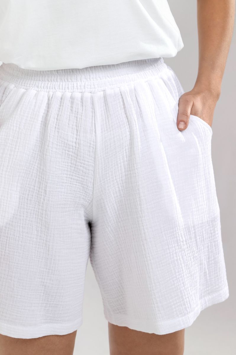 Шорты женские из тканого полотна «муслин» с набивным рисунком, свободные, с карманами в боковых швах, на притачном поясе с эластичной тесьмой внутри.