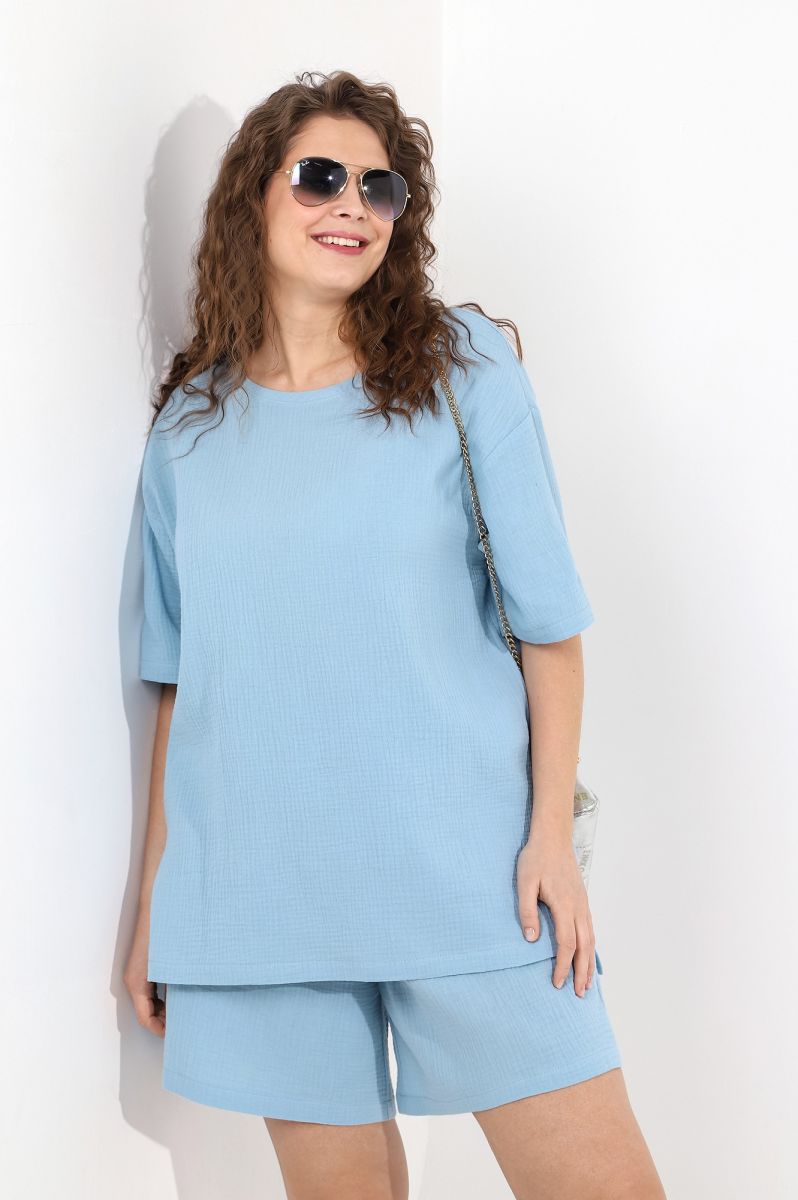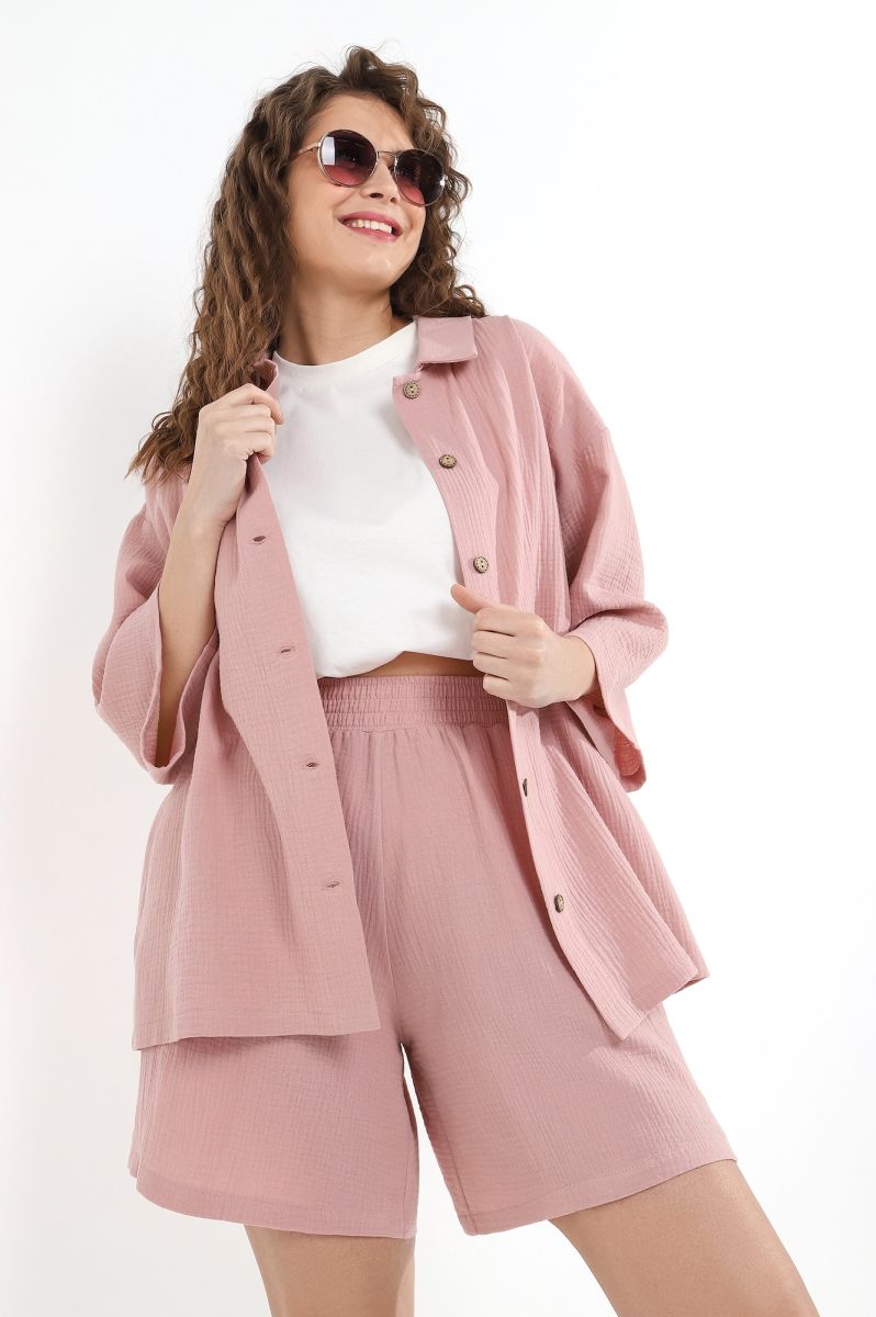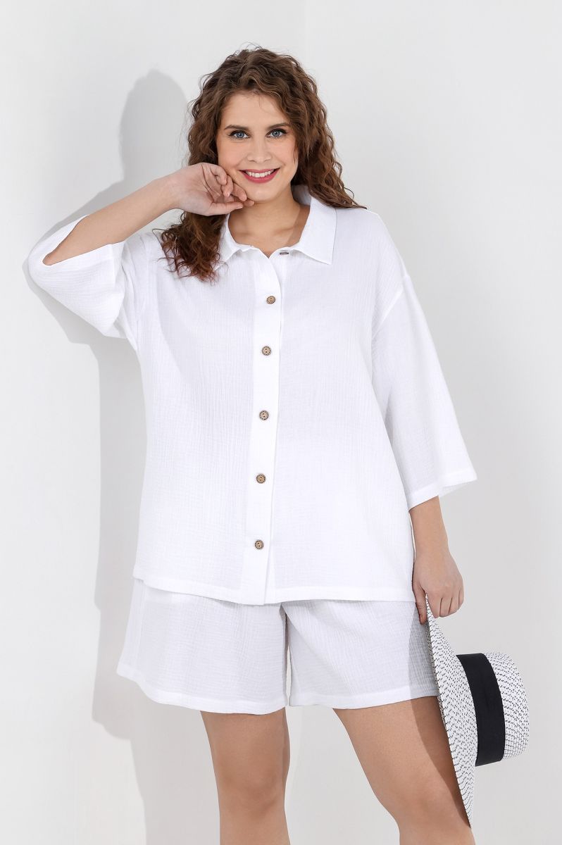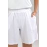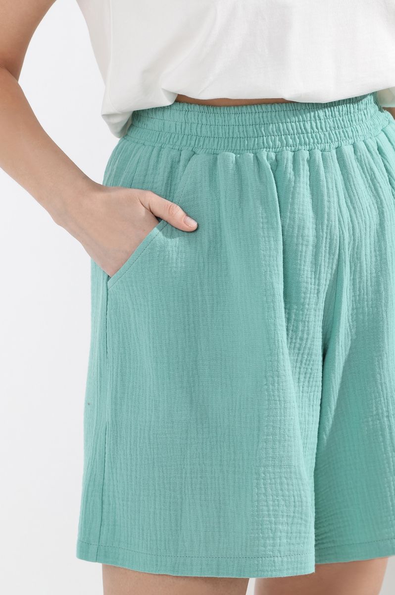 Шорты женские из тканого полотна «муслин» с набивным рисунком, свободные, с карманами в боковых швах, на притачном поясе с эластичной тесьмой внутри.