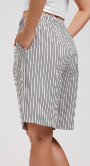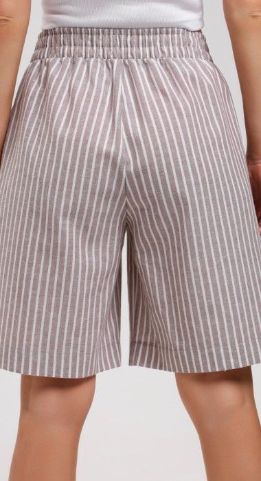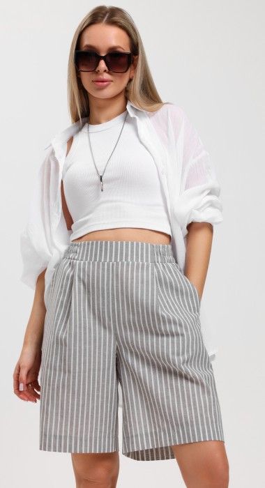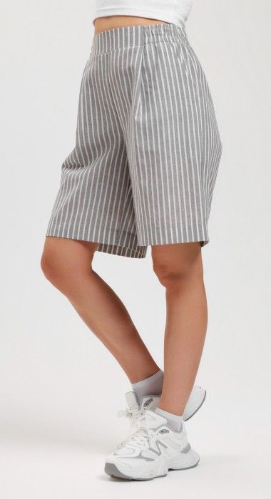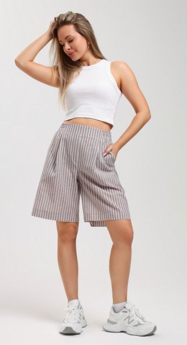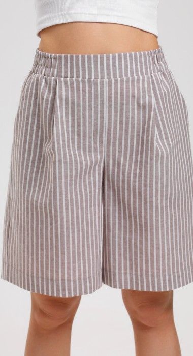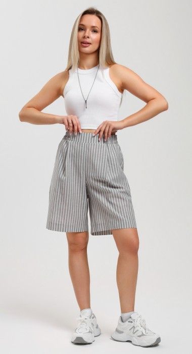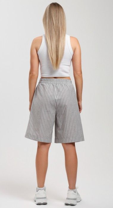 Шорты – свободные, с карманами в боковых швах, с двумя заложенными складками пот алии, на притачном поясе с эластичной тесьмой внутри. Средний шов передних половин обработан имитацией «гульфика».