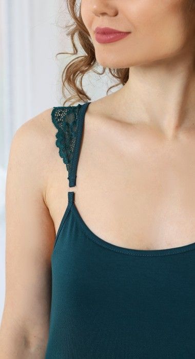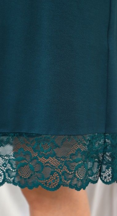 Сорочка молодежная из гладкокрашенного вискозного полотна, слегка расширенная книзу, с горловиной овальной формы, без рукавов на бретелях. Горловина и проймы окантованы основным материалом, детали бретелей выкроены из кружева, низ изделия отделан кружевом.