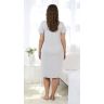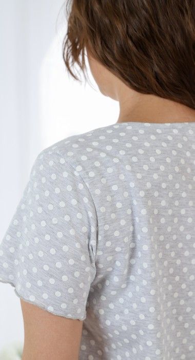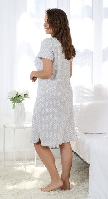 Сорочка женская из трикотажного полотна «кулирка» с набивным рисунком, свободного покроя, с короткими рукавами. Перед – лиф «бюстье» и двумя небольшими притачными кокетками. Верхние срезы лифа, образующие v-образный вырез спереди, отделаны кружевом. Чашечки лифа присборены по шву притачивания к основной детали переда. Горловина окантована основным материалом. Рукава и низ изделия с разрезом, обработан узкой обметочной строчкой, образующей красивый волнистый край.