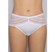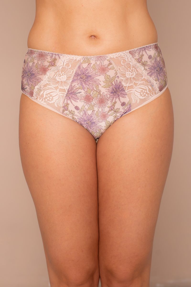 Трусы из эластичного принтованного полотна, эластичного кружева, х/б ластовица, с высокой линией талии. Отделка эластичной декоративной тесьмой.