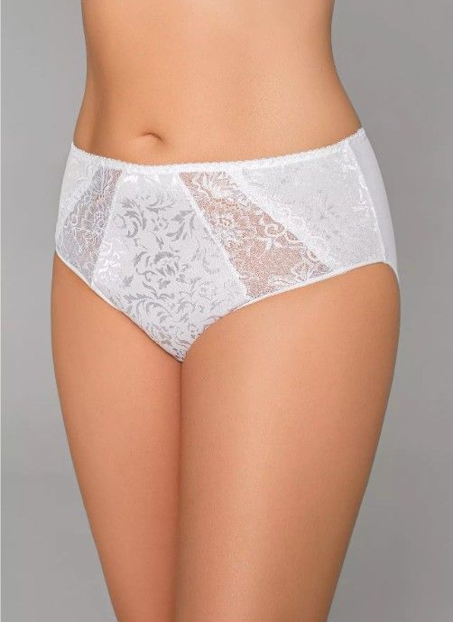 Трусы из эластичного полотна, эластичного кружева, х/б ластовица, с высокой линией талии. Отделка эластичной декоративной тесьмой.