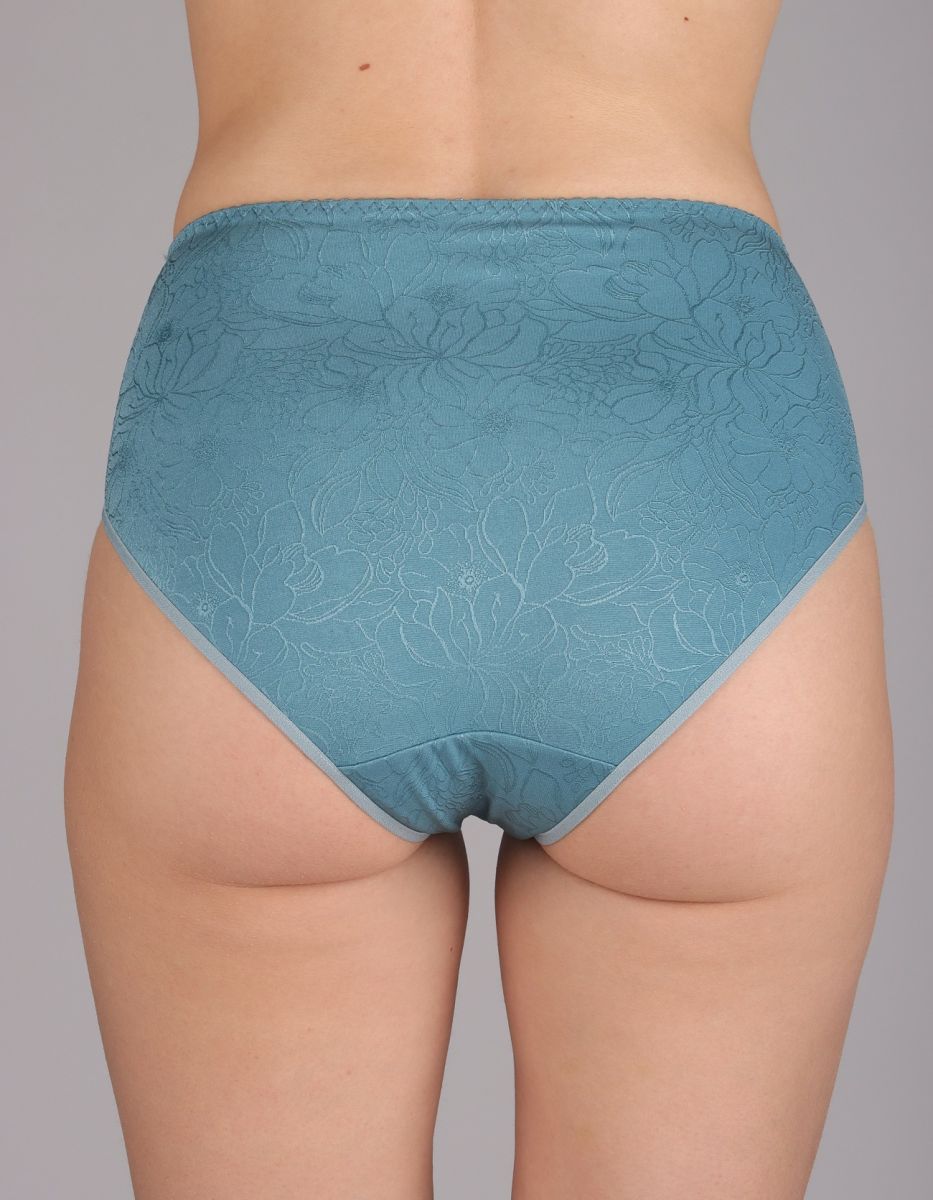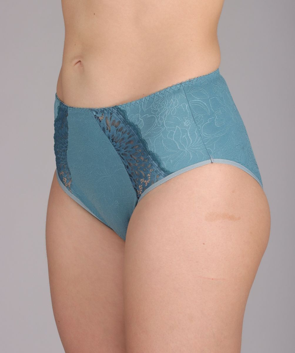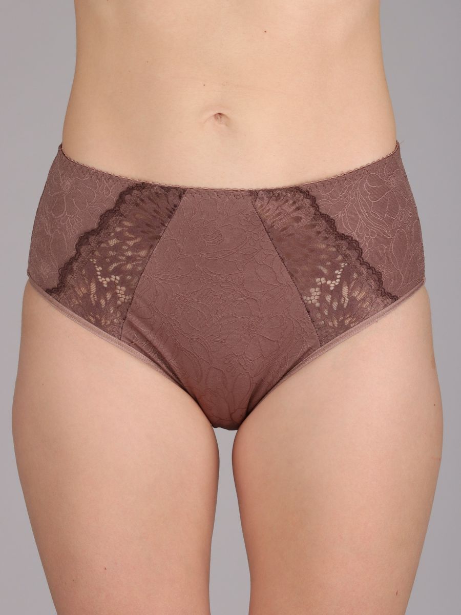 Трусы из эластичного жаккардового полотна, эластичного кружева, х/б ластовица, с высокой линией талии. Отделка эластичной декоративной тесьмой.