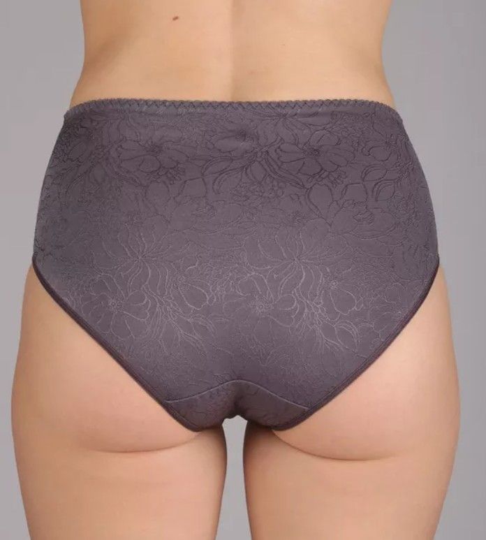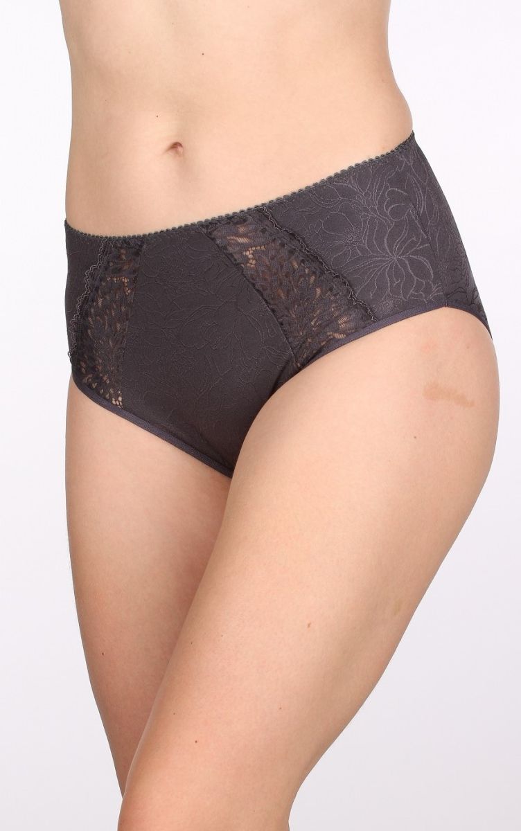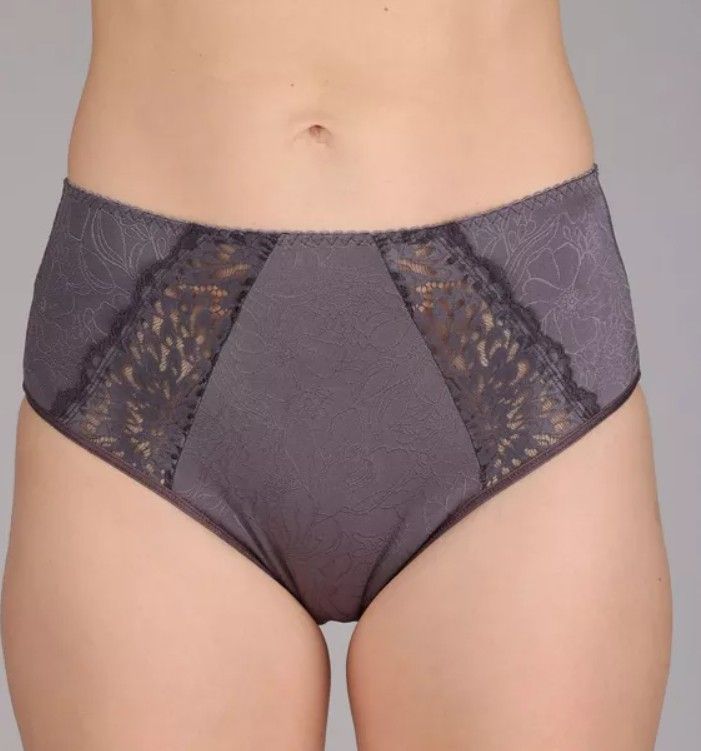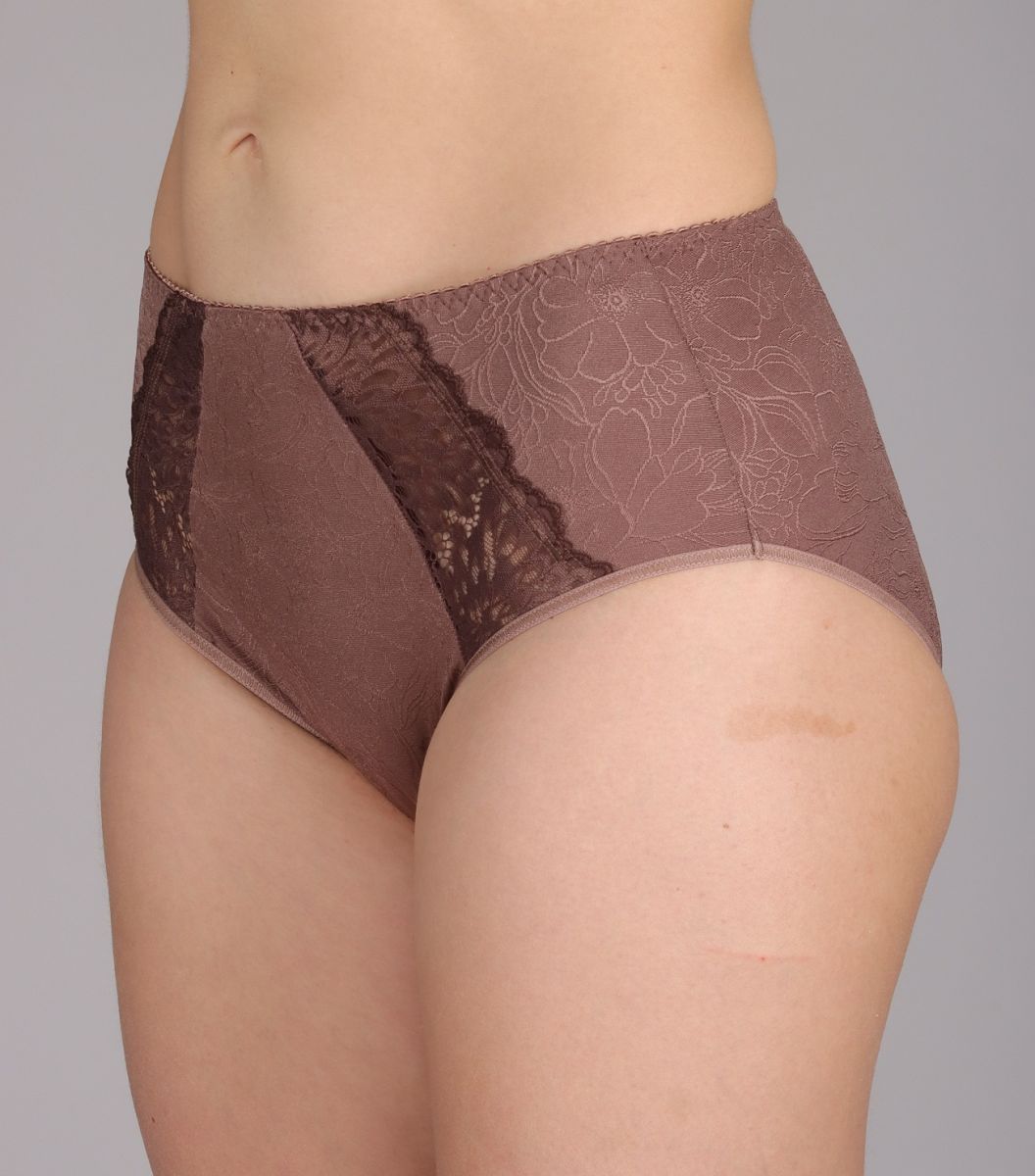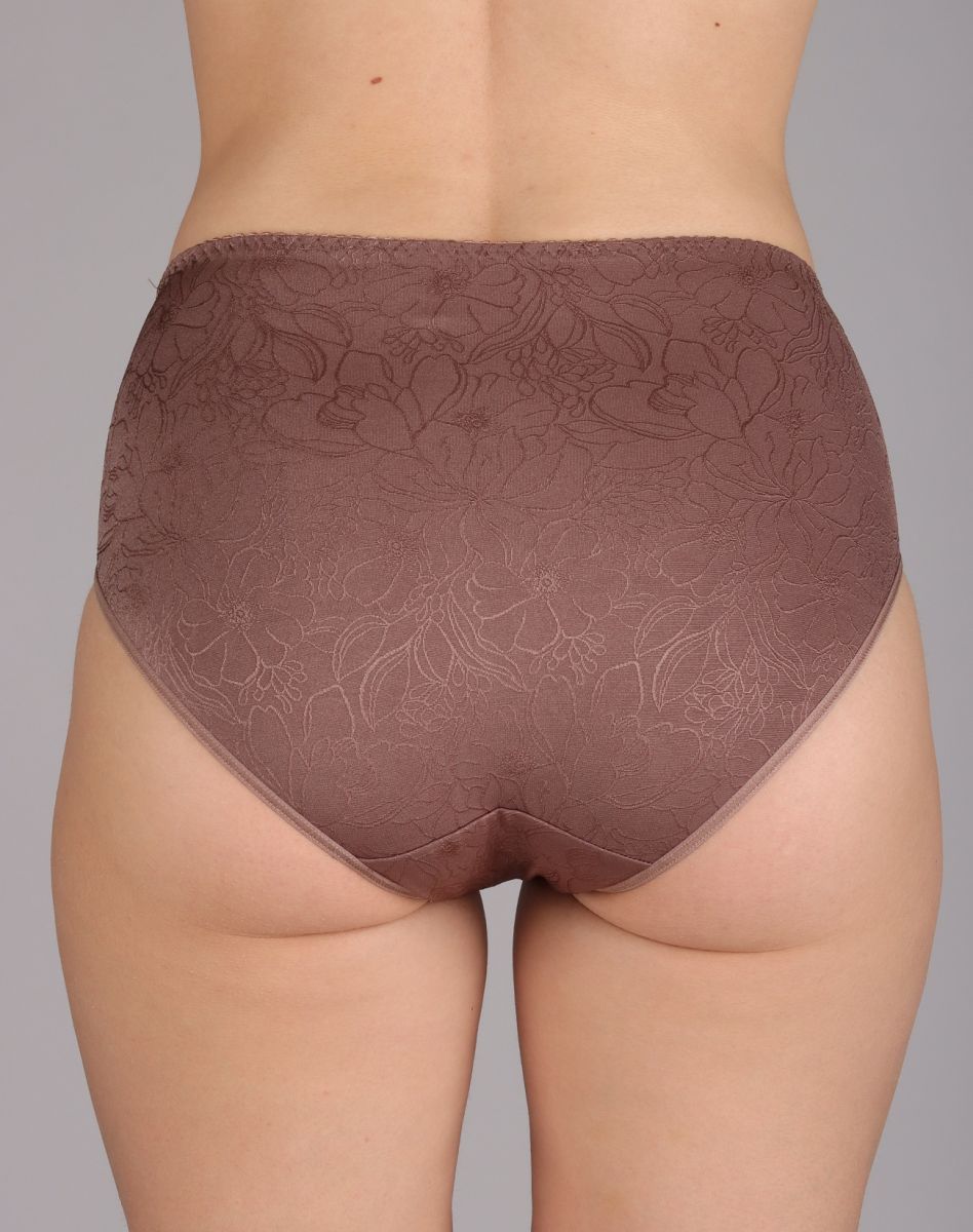 Трусы из эластичного жаккардового полотна, эластичного кружева, х/б ластовица, с высокой линией талии. Отделка эластичной декоративной тесьмой.