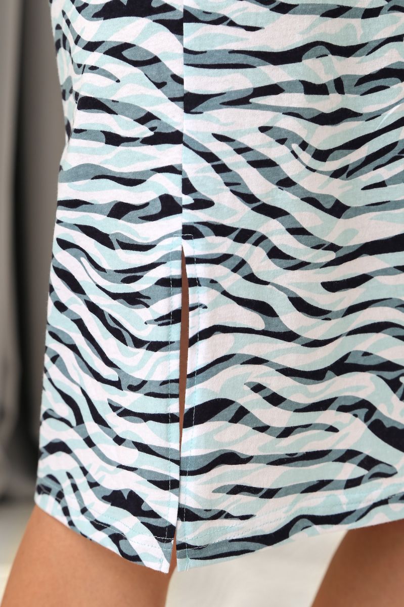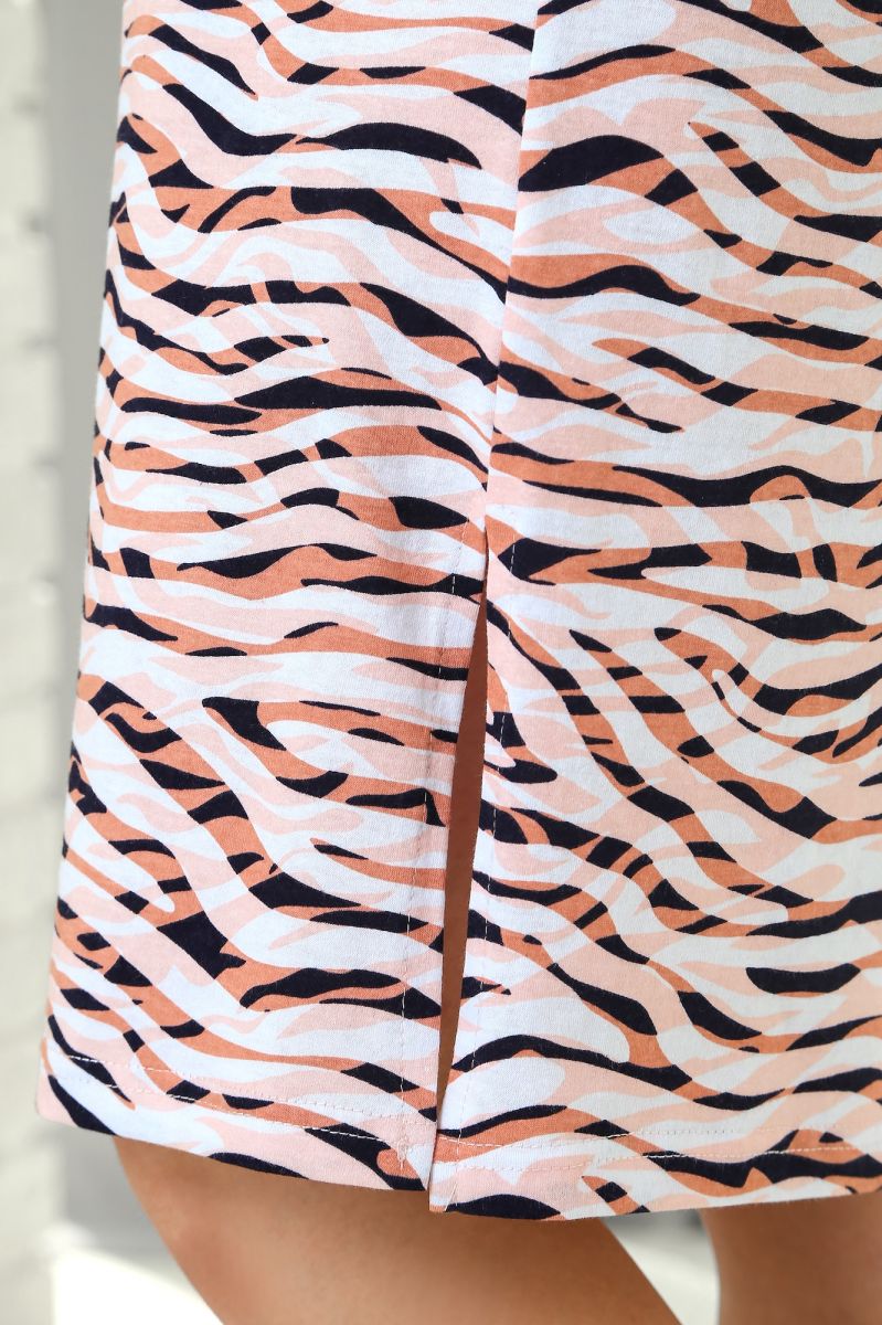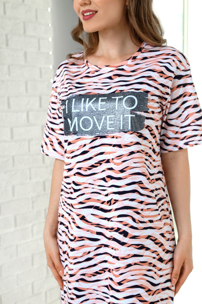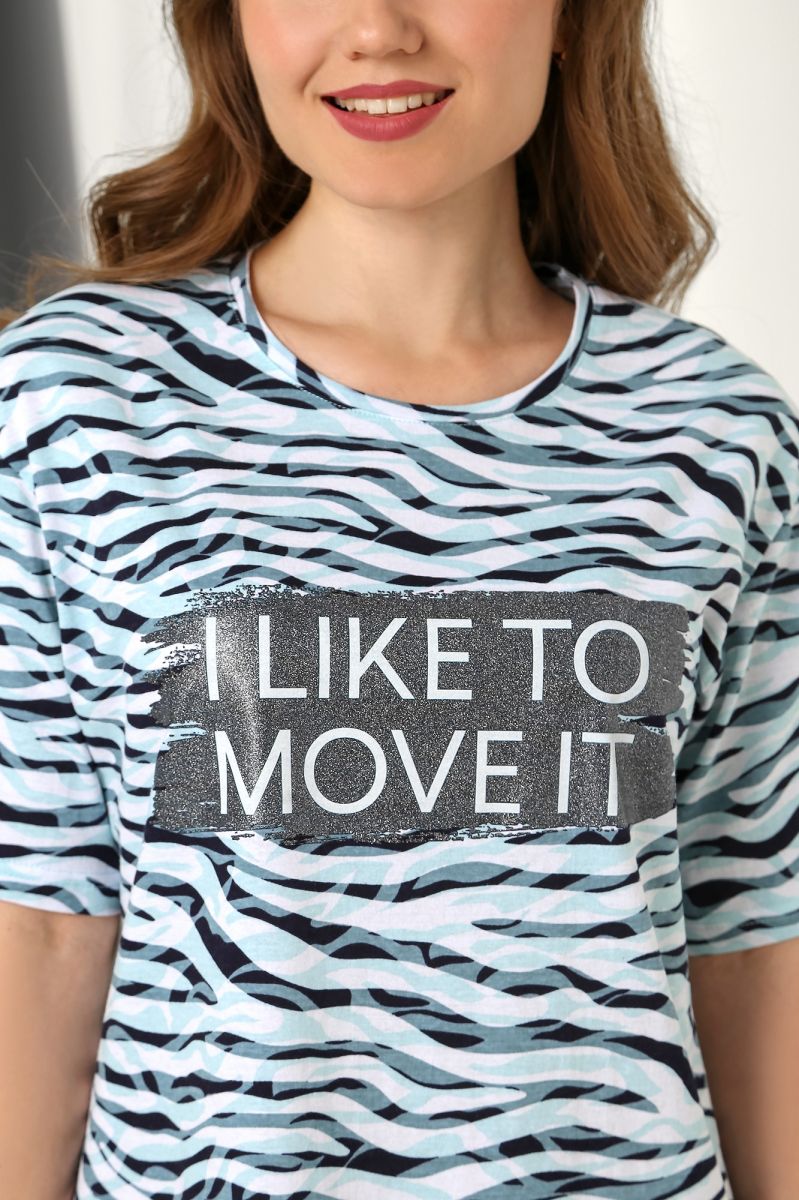 Из трикотажного полона «кулирка» с набивным рисунком, прямого силуэта, с короткими втачными рукавами, горловиной овальной формы, обработанной притачной бейкой и разрезами в боковых швах.