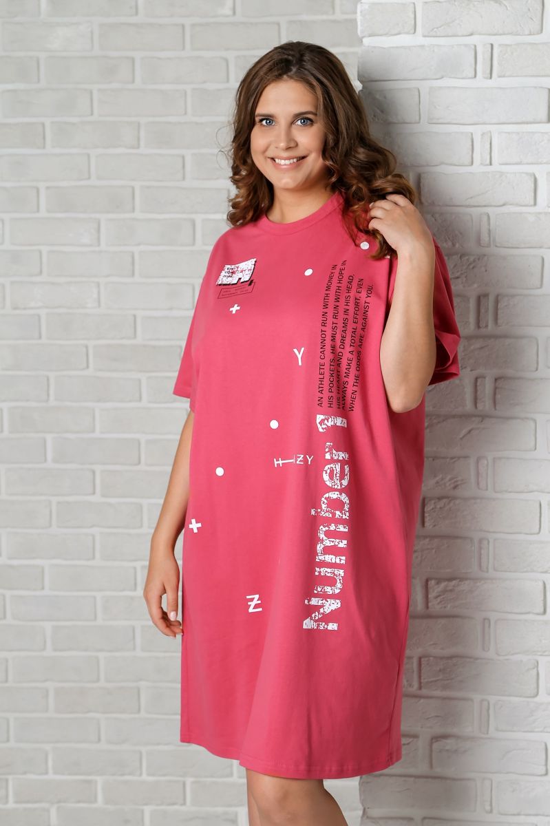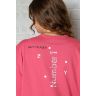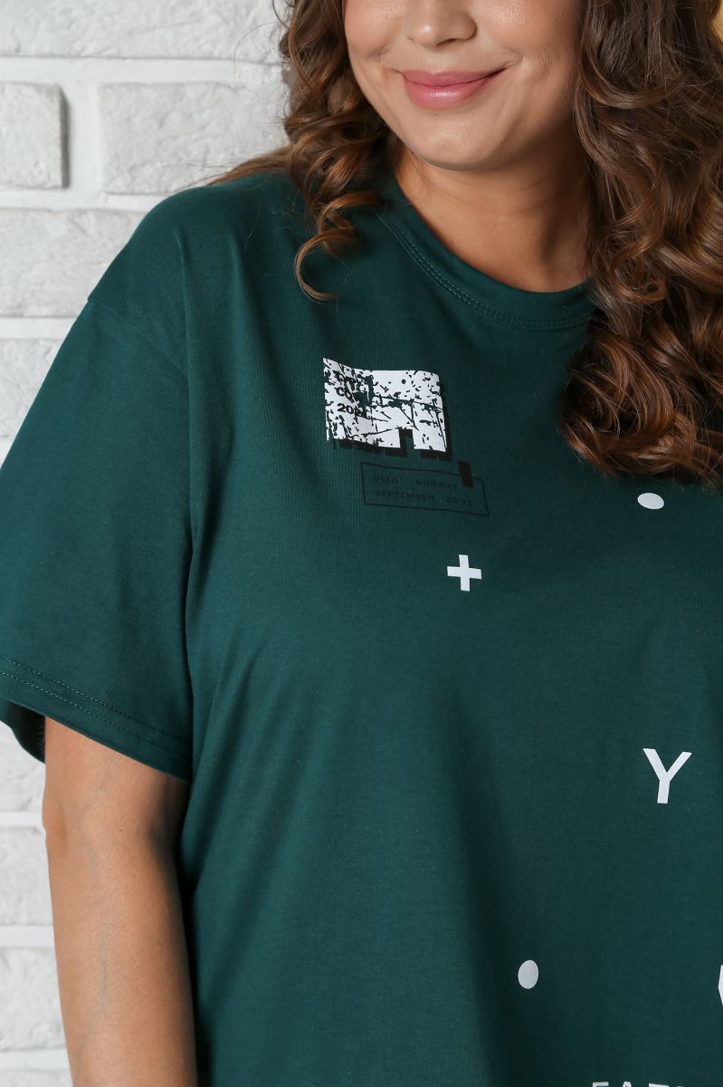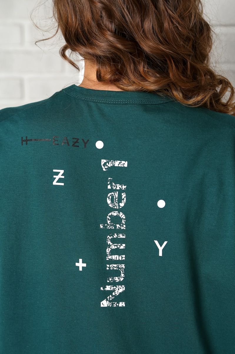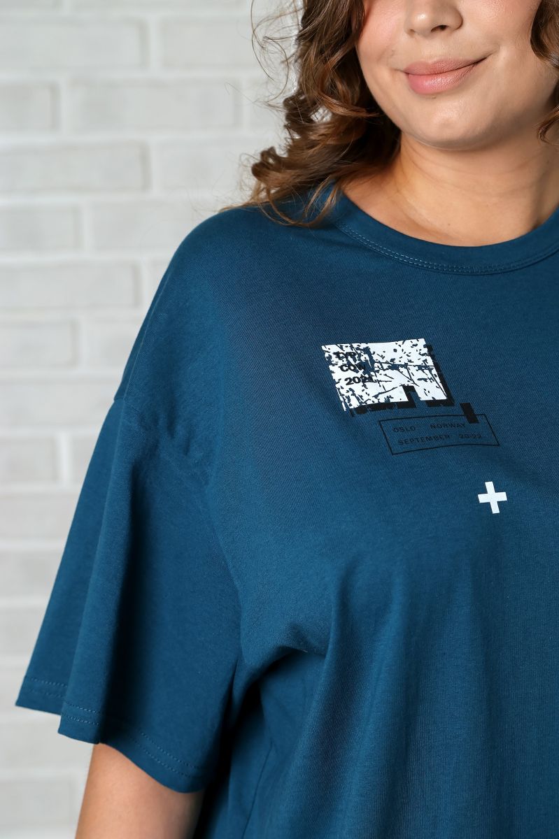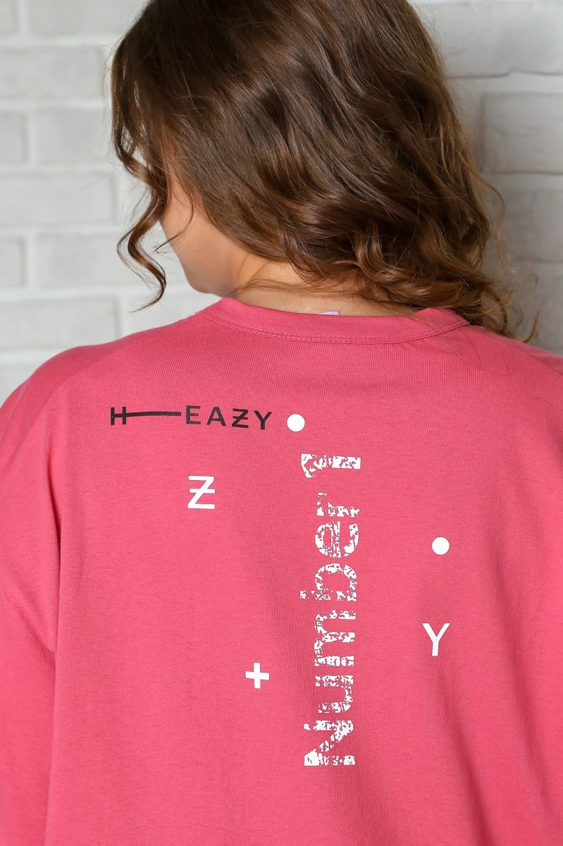 Из гладкокрашеного трикотажного полотна «кулирка», свободного покроя, прямого силуэта, с короткими втачными рукавами, горловиной овальной формы, окантованной основным материалом и принтами в центре переда и на спинке.