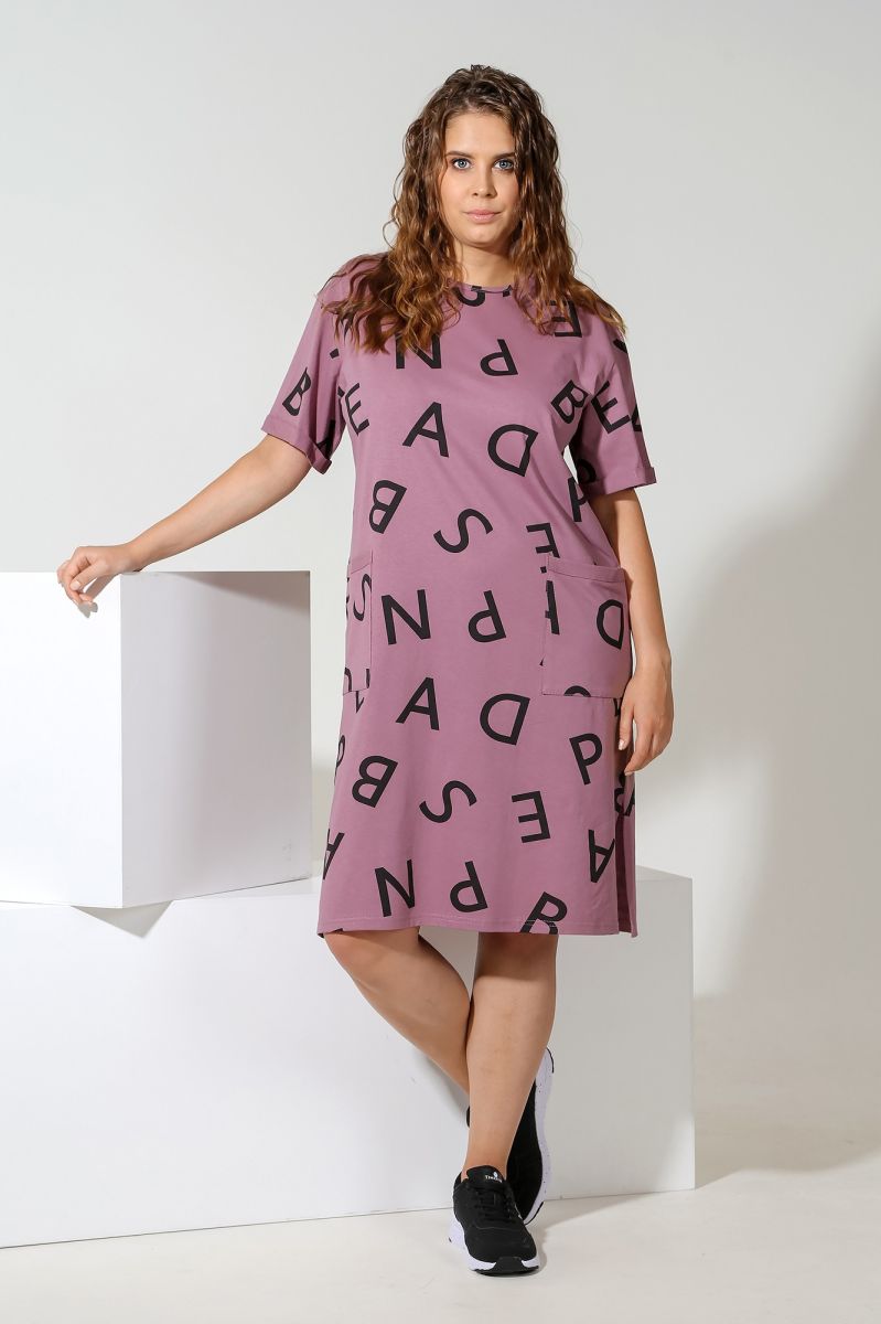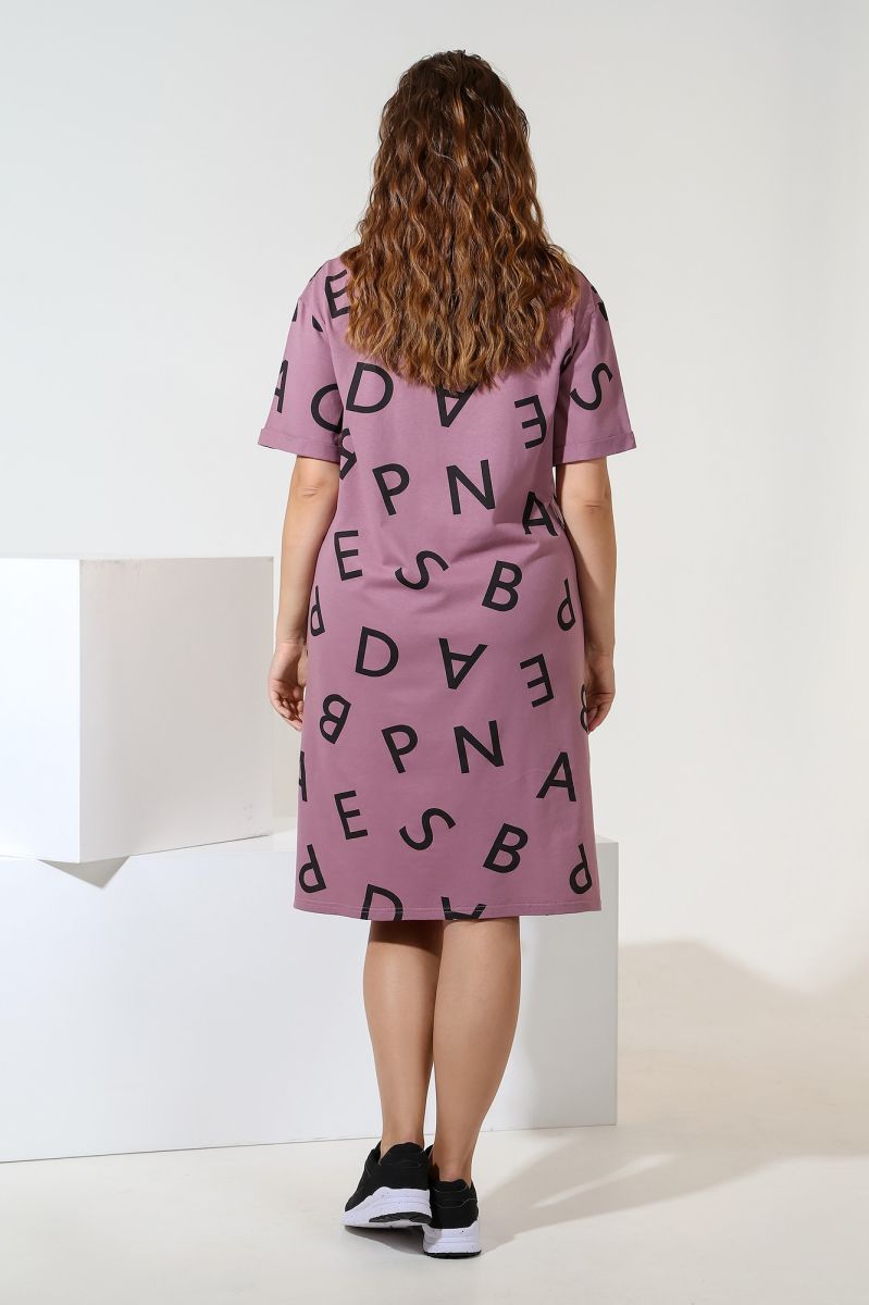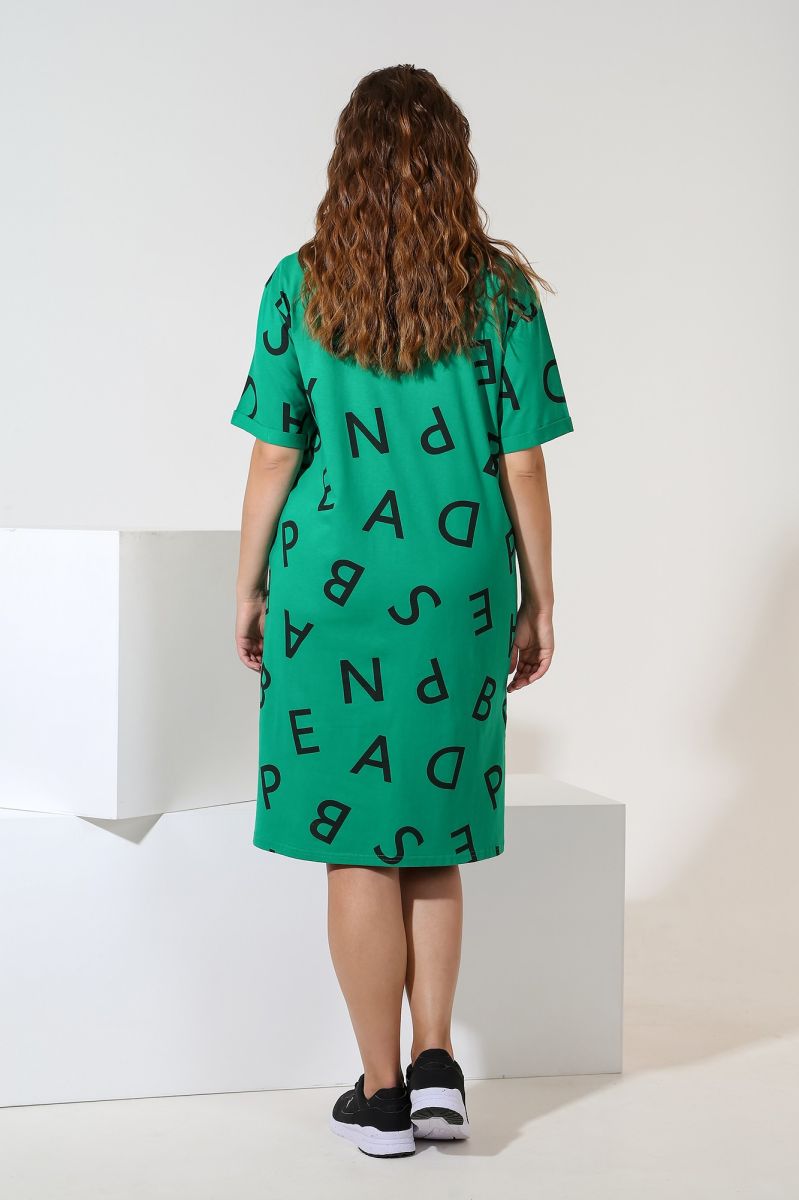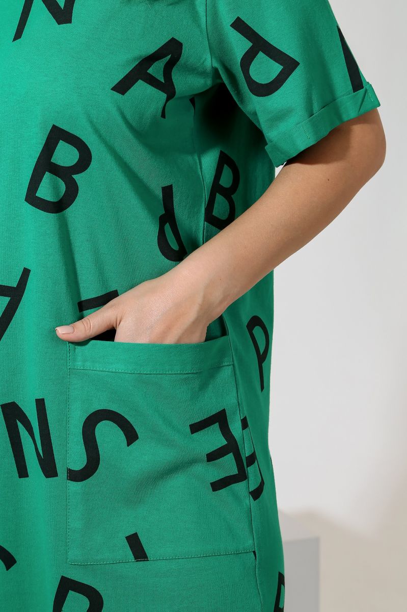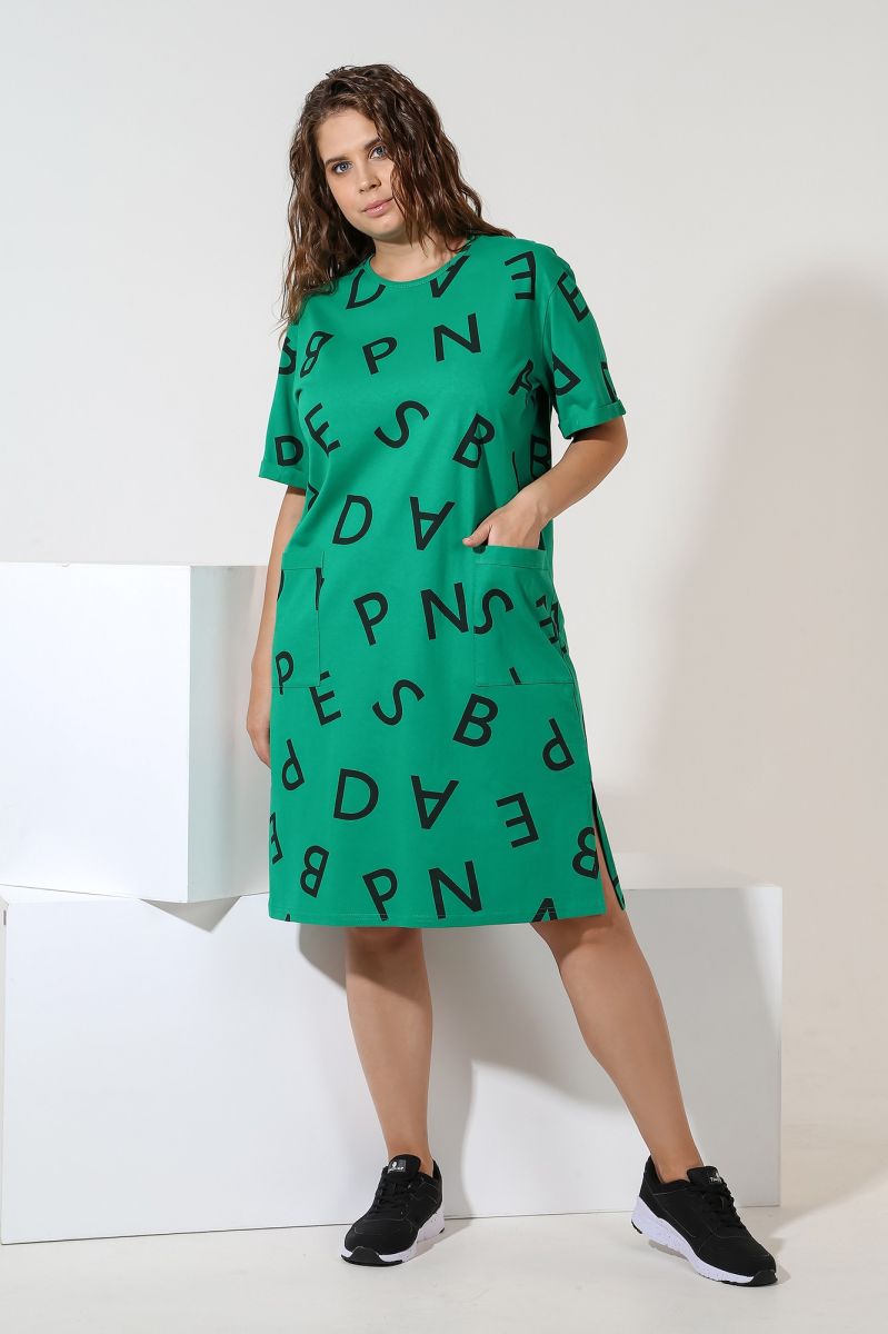 Из трикотажного полотна «кулирка» с набивным рисунком, прямого силуэта, с короткими втачными рукавами, горловиной овальной формы, окантованной основным материалом, двумя накладными карманами на уровне бедер и разрезами в боковых швах. Нижние срезы рукавов обработаны двойной подгибкой на лицевую сторону изделия без обметывания срезов и настрачивания подгибки. Верхние срезы карманов обработаны двойной подгибкой на лицевую сторону с настрачиванием подогнутого края.