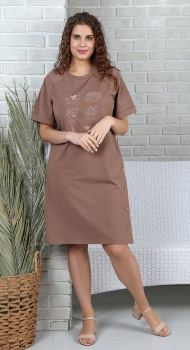 Туника женская из гладкокрашеного трикотажного полотна «кулирка» с лайкрой, прямого силуэта, с короткими рукавами «реглан», горловиной овальной формы, окантованной основным материалом и вышивкой в центре переда. В левом боковом шве – имитация шлицы с декоративными пуговицами. Низ рукавов обработан с притачными манжетами-отворотами.