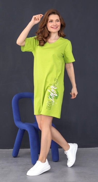 Туника молодежная из гладкокрашеного трикотажного полотна «кулирка», прямого силуэта, с короткими втачными рукавами, горловиной v-образной формы, окантованной основным материалом, и принтом на полочке в технике «шелкографии».