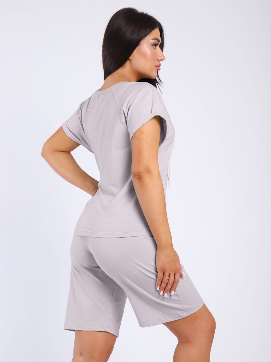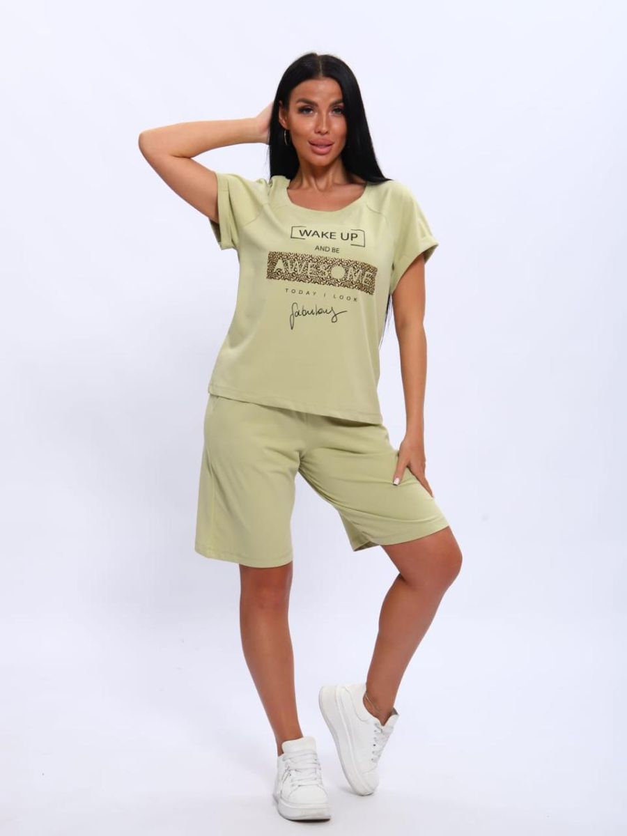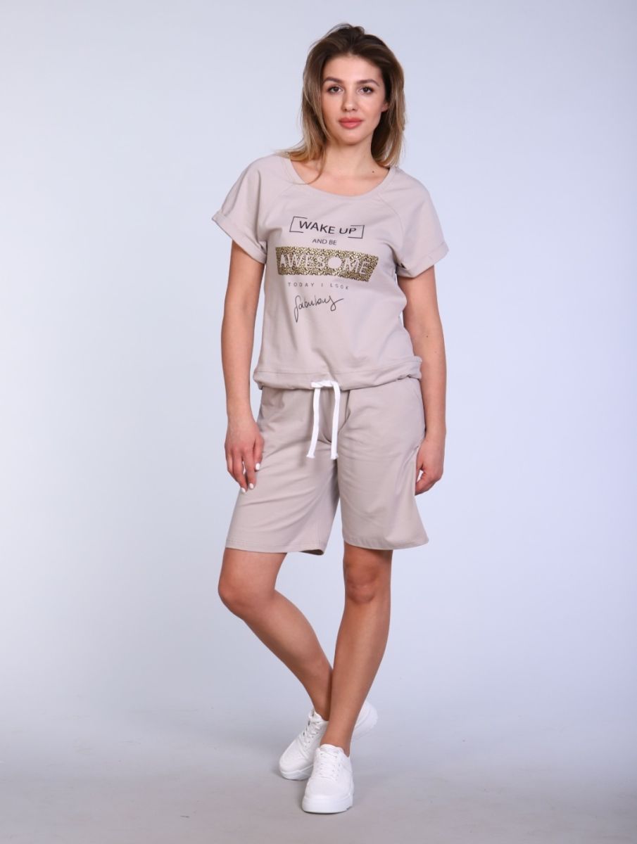 Женский костюм с удачным кроем и отличной посадкой, является незаменимым помощником, поэтому отказать себе иметь такой женский комплект невозможно. Футболка с коротким рукавом и с фиксацией в виде шнурков на поясе, широкие шорты с двумя врезными карманами по бокам - все это атрибуты удобной женской одежды. Выглядеть красиво дома, принимать гостей, снимать сторис, работать и выходить на онлайн созвоны - это всё вы спокойно можете делать в нашем костюме, вам не захочется его снимать.