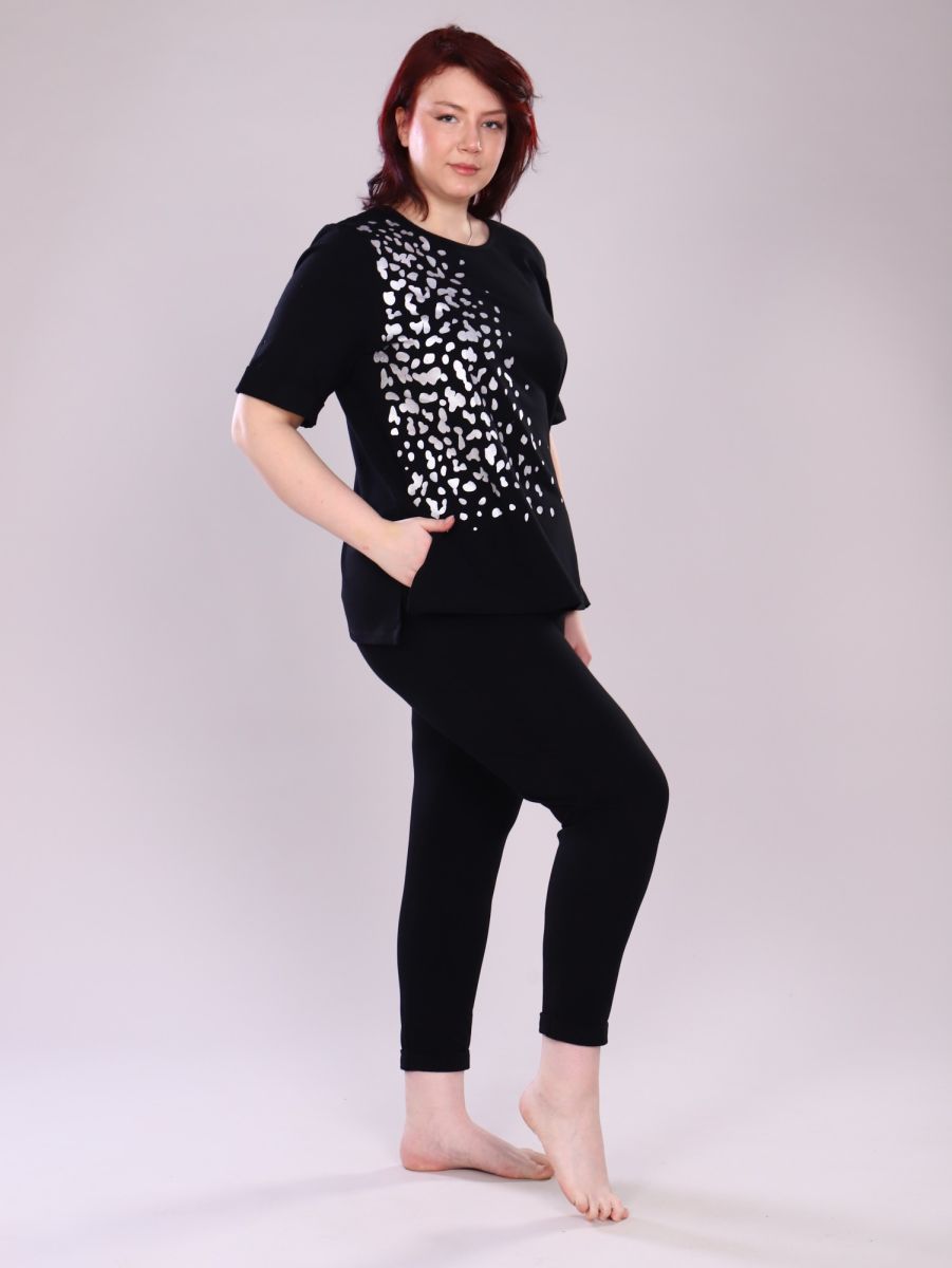 Кофта - туника с разрезами по бокам и короткими рукавами, декорирована принтом.