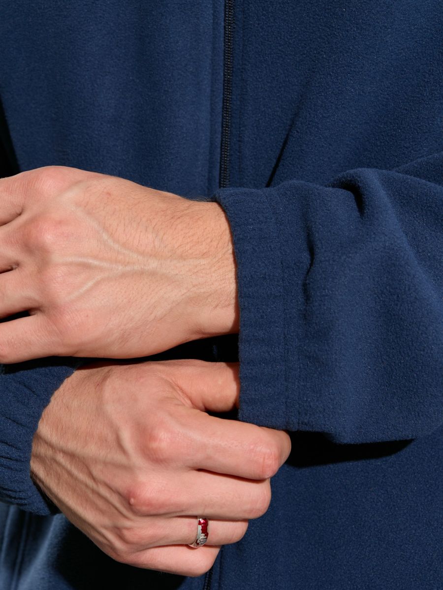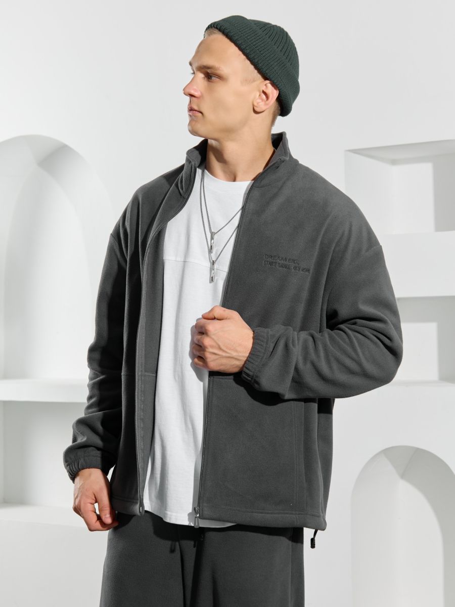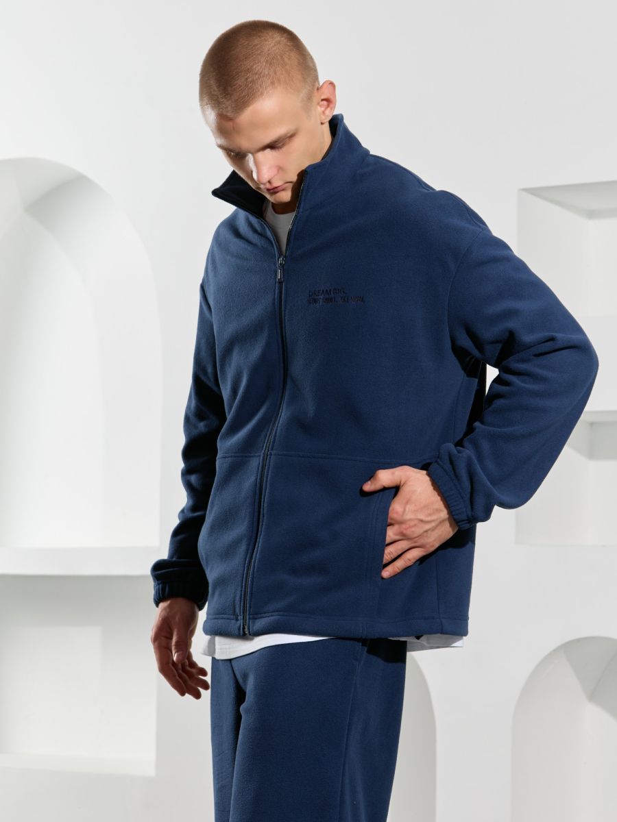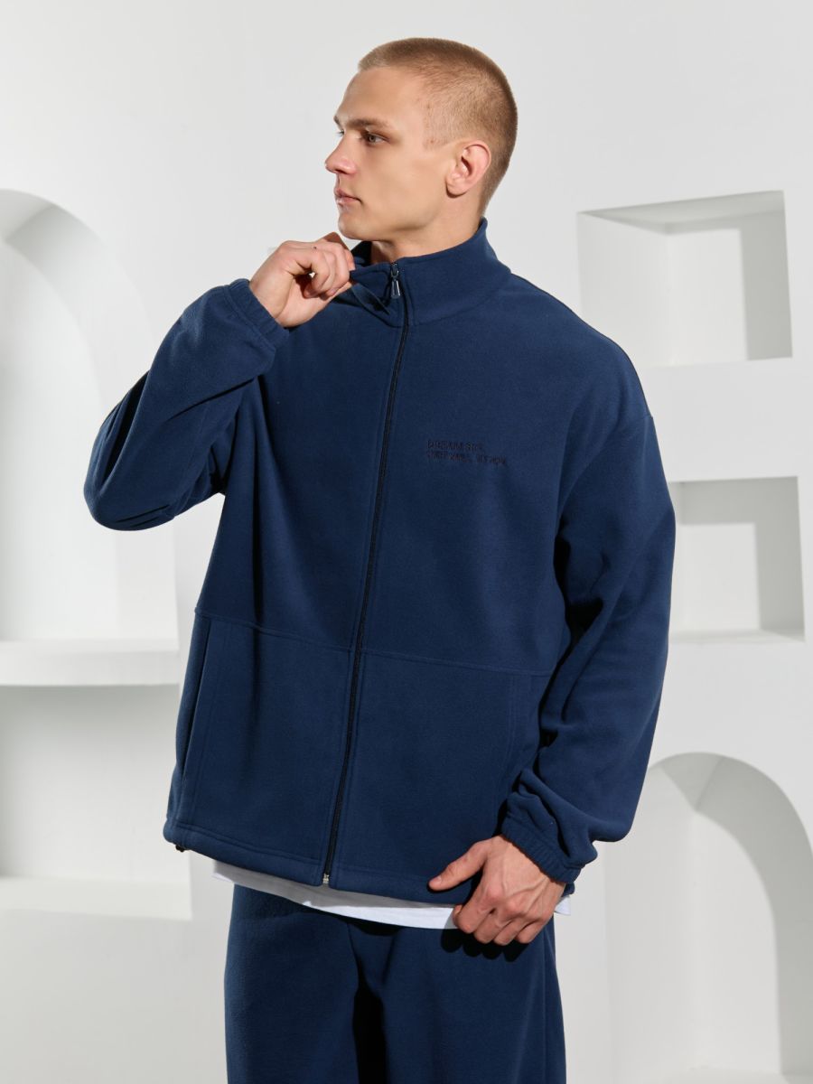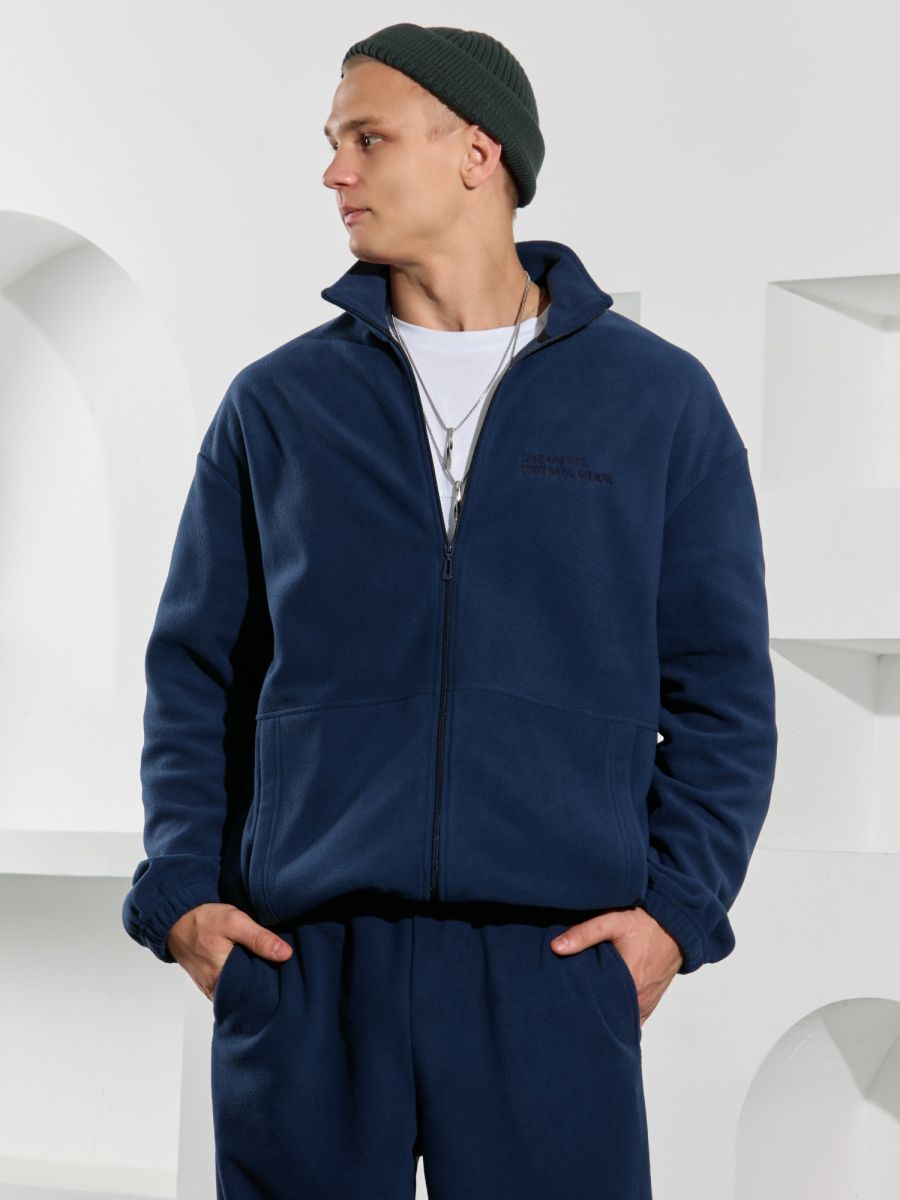 Куртка-толстовка мужская из флиса, с длинными втачными рукавами, воротником-стойкой и центральной бортовой застежкой на тесьму "молния". На полочках -кокетки и накладные карманы с вертикальными входами, на левой полочке в области груди - вышивка. Нижние срезы рукавов обработаны подгибкой с эластичной тесьмой, а низ изделия - с вложением в шов шляпной резинки с фиксаторами для регулирования степени прилегания изделия по бедрам.