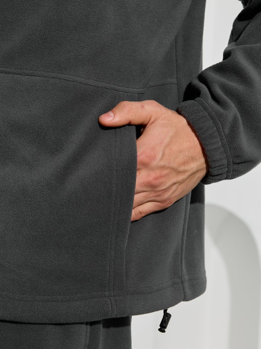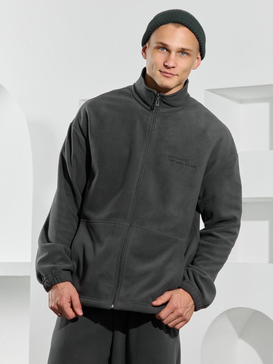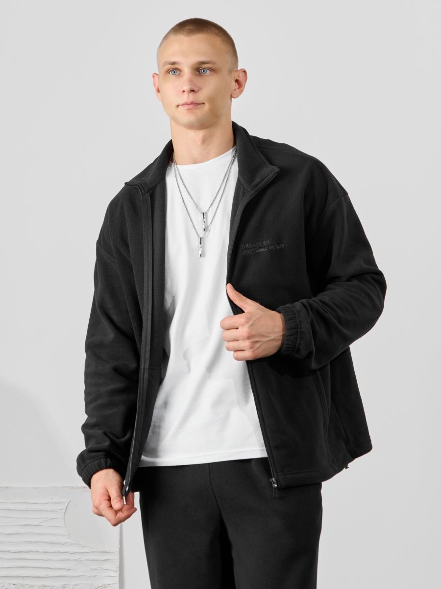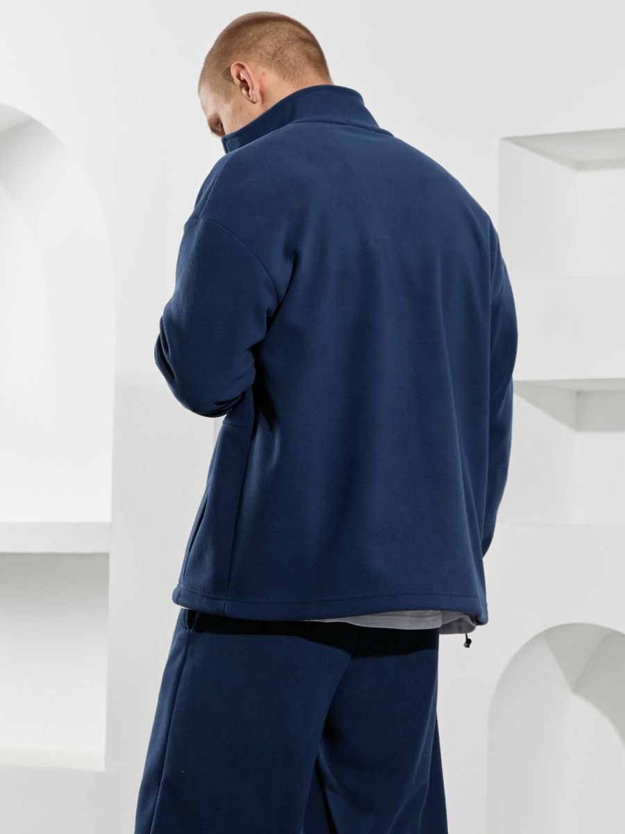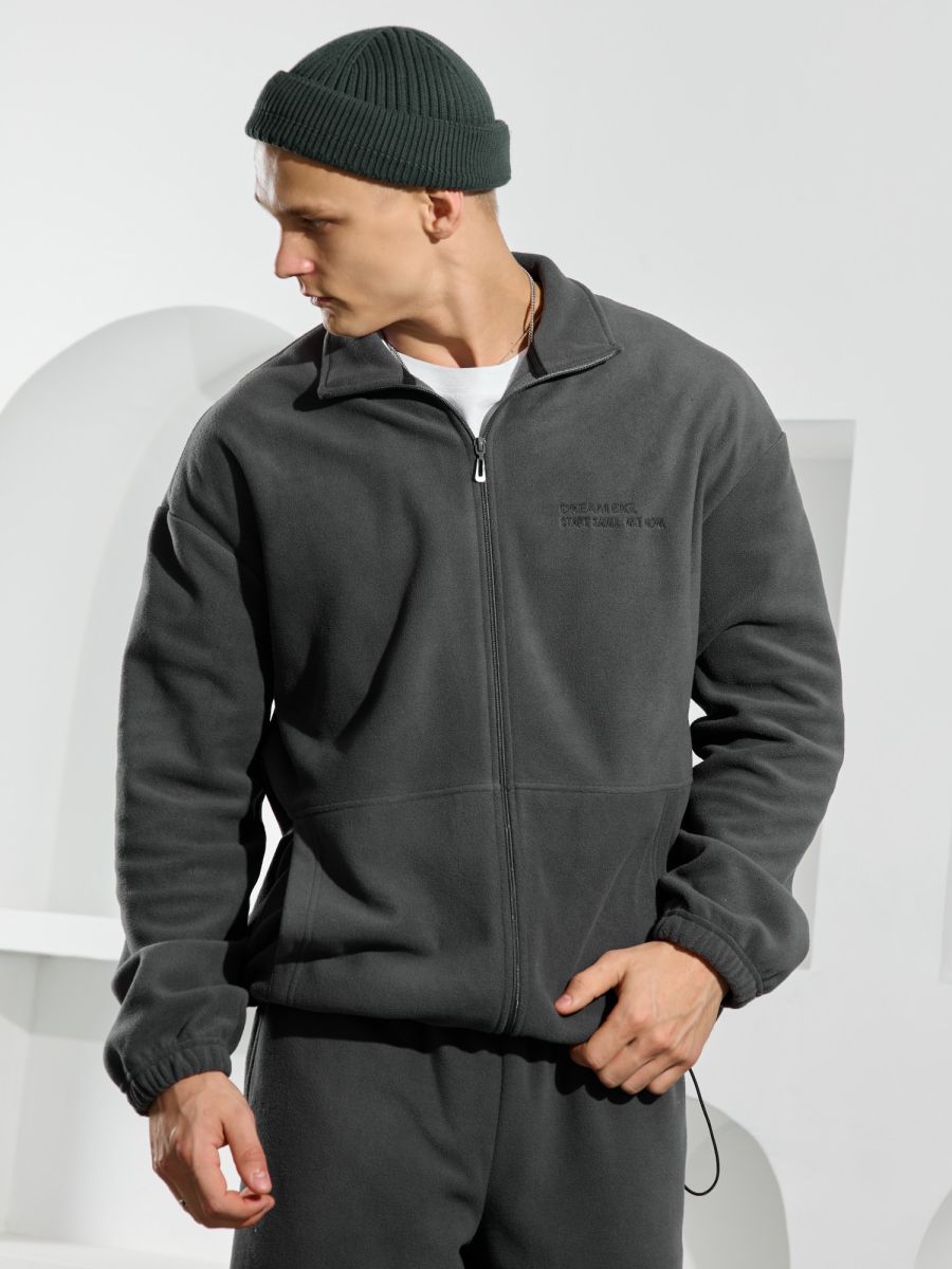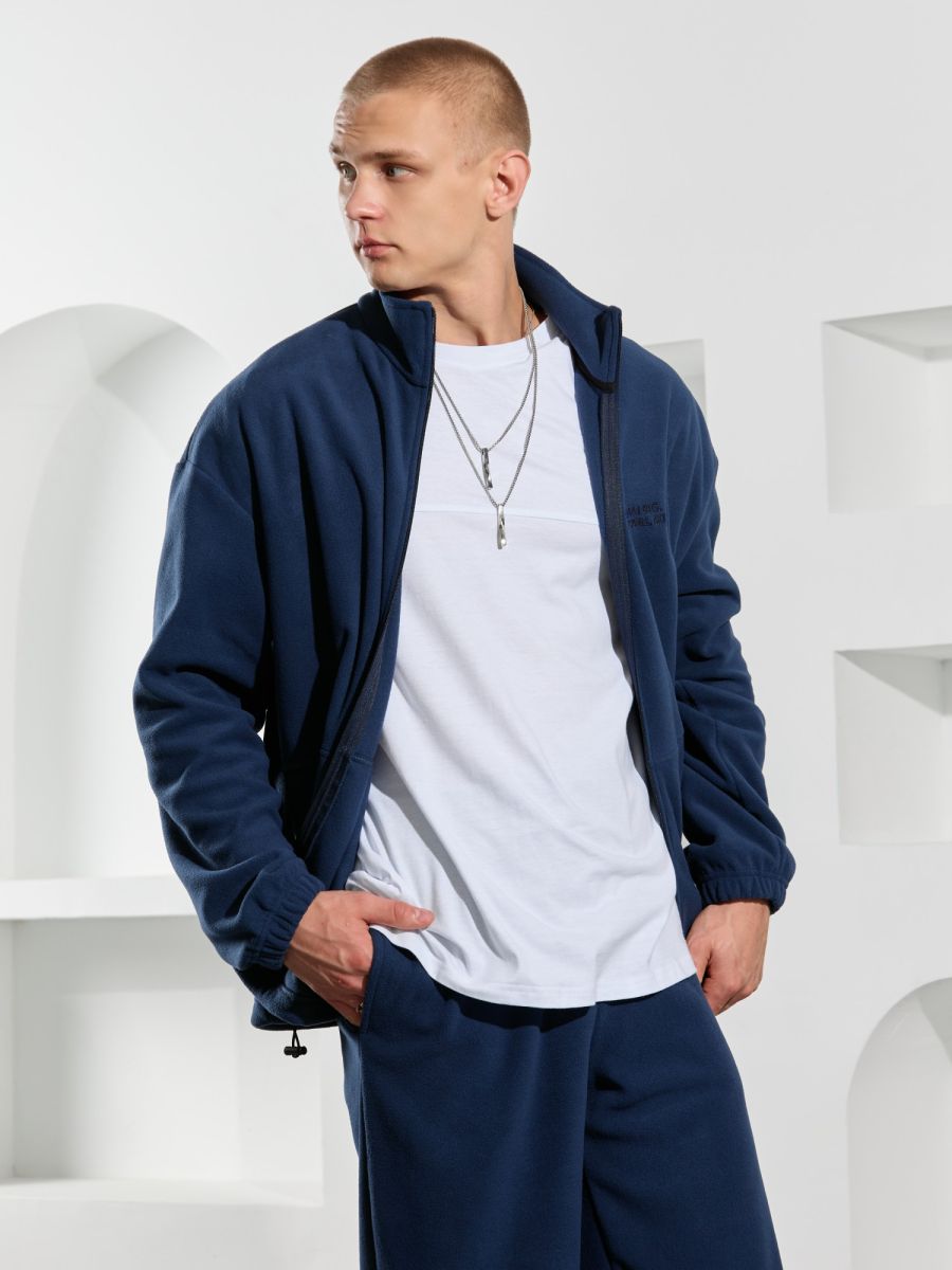 Куртка-толстовка мужская из флиса, с длинными втачными рукавами, воротником-стойкой и центральной бортовой застежкой на тесьму "молния". На полочках -кокетки и накладные карманы с вертикальными входами, на левой полочке в области груди - вышивка. Нижние срезы рукавов обработаны подгибкой с эластичной тесьмой, а низ изделия - с вложением в шов шляпной резинки с фиксаторами для регулирования степени прилегания изделия по бедрам.