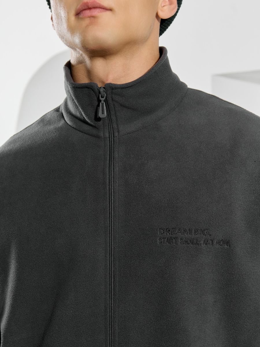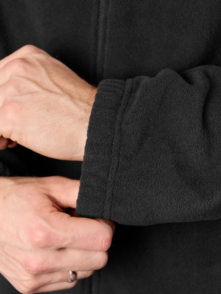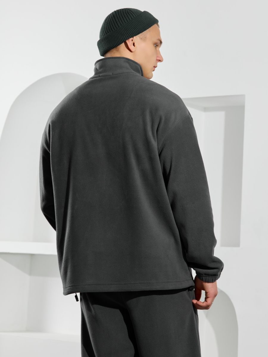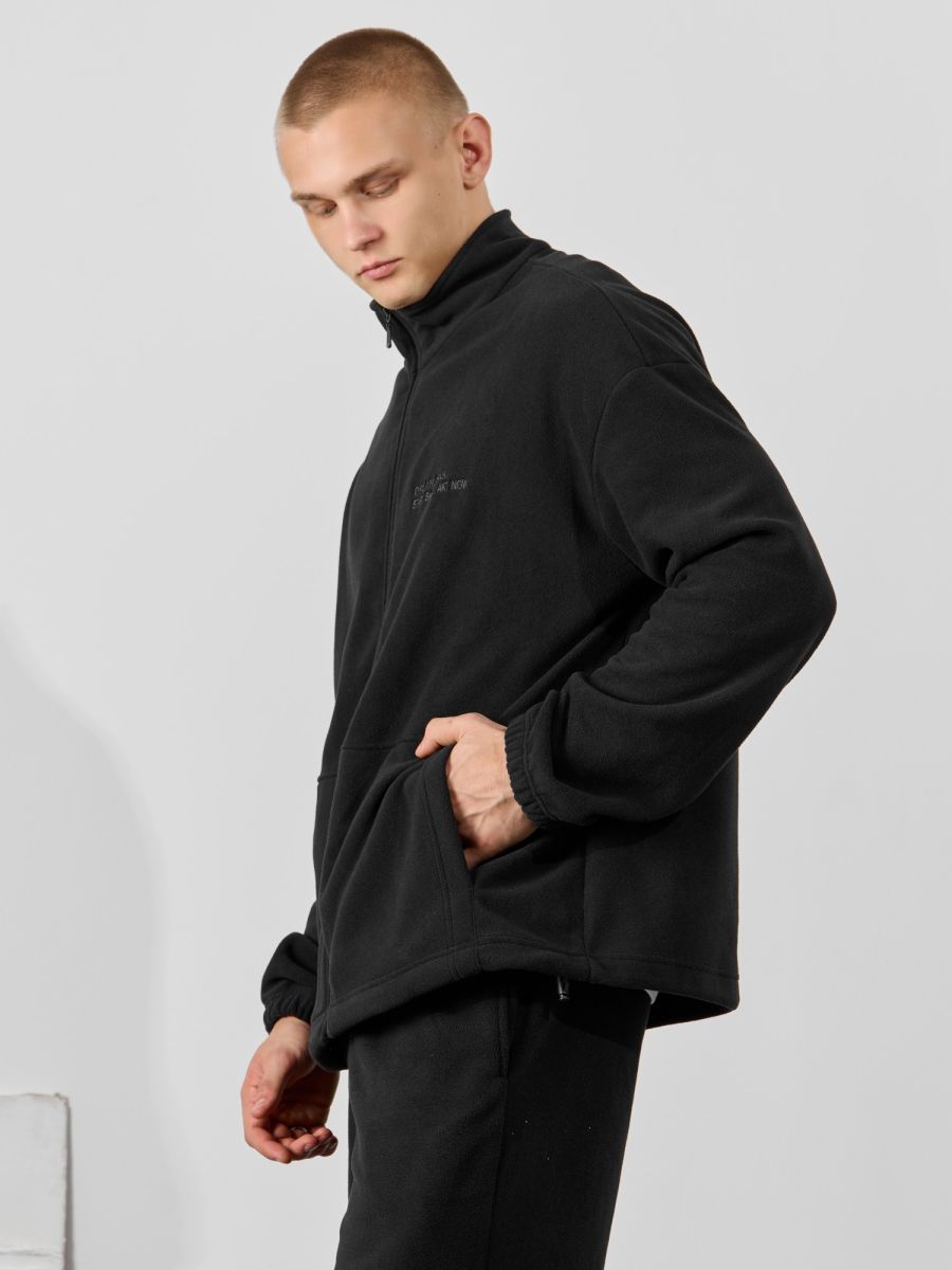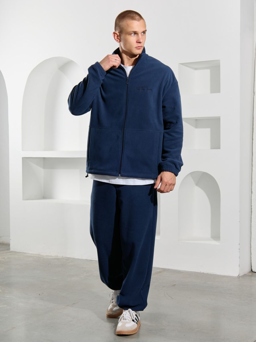 Куртка-толстовка мужская из флиса, с длинными втачными рукавами, воротником-стойкой и центральной бортовой застежкой на тесьму "молния". На полочках -кокетки и накладные карманы с вертикальными входами, на левой полочке в области груди - вышивка. Нижние срезы рукавов обработаны подгибкой с эластичной тесьмой, а низ изделия - с вложением в шов шляпной резинки с фиксаторами для регулирования степени прилегания изделия по бедрам.
