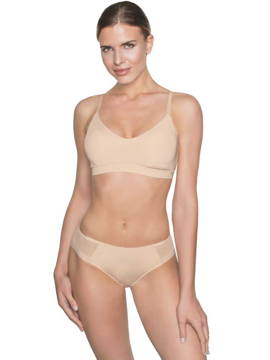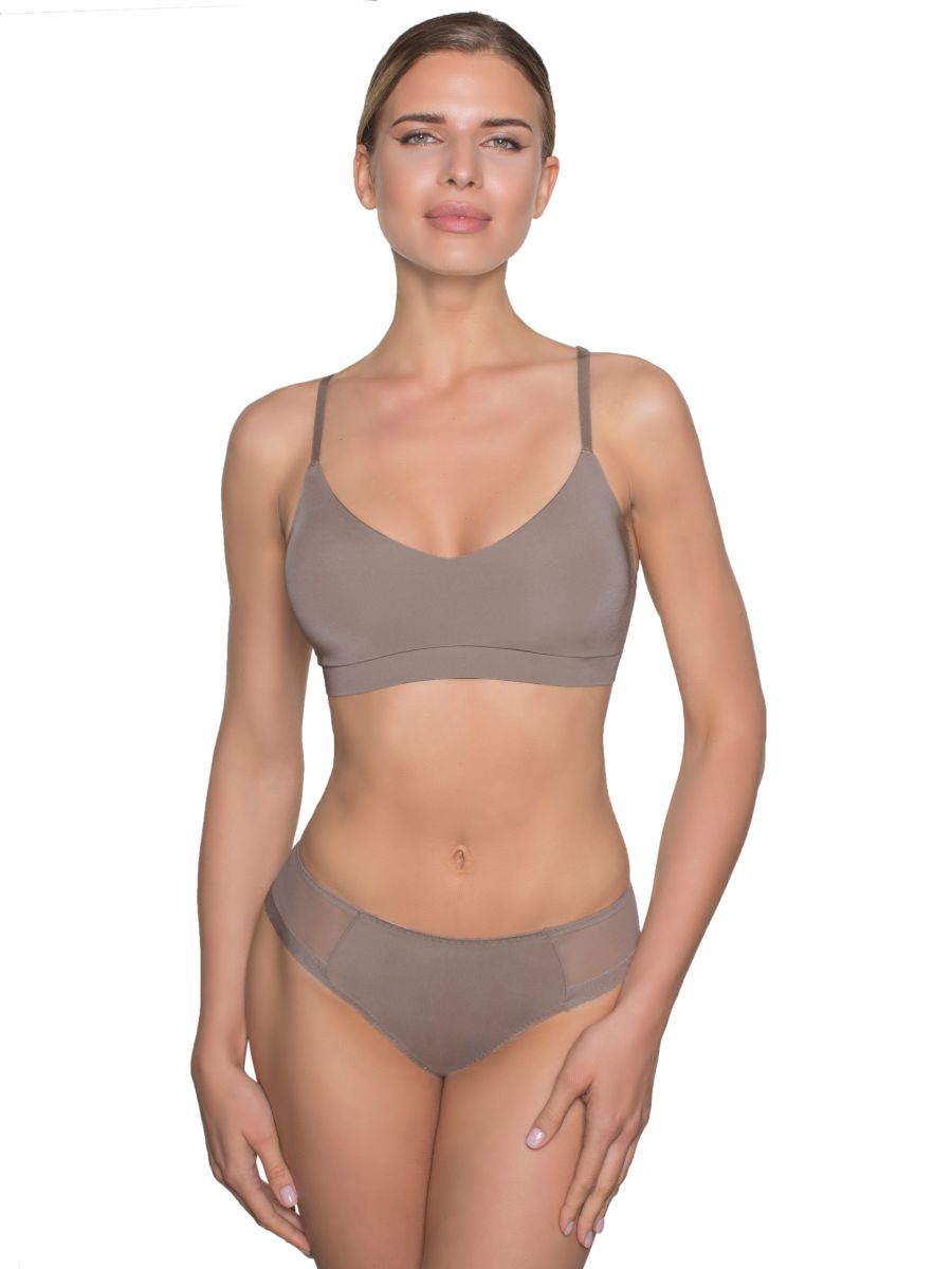 Топ с мягкими чашками без косточек со съемными формованными вкладышами. Несъемные, регулируемые бретельки. Без застежки на спинке. Выполнен из микрофибры. Коллекция "Milla".