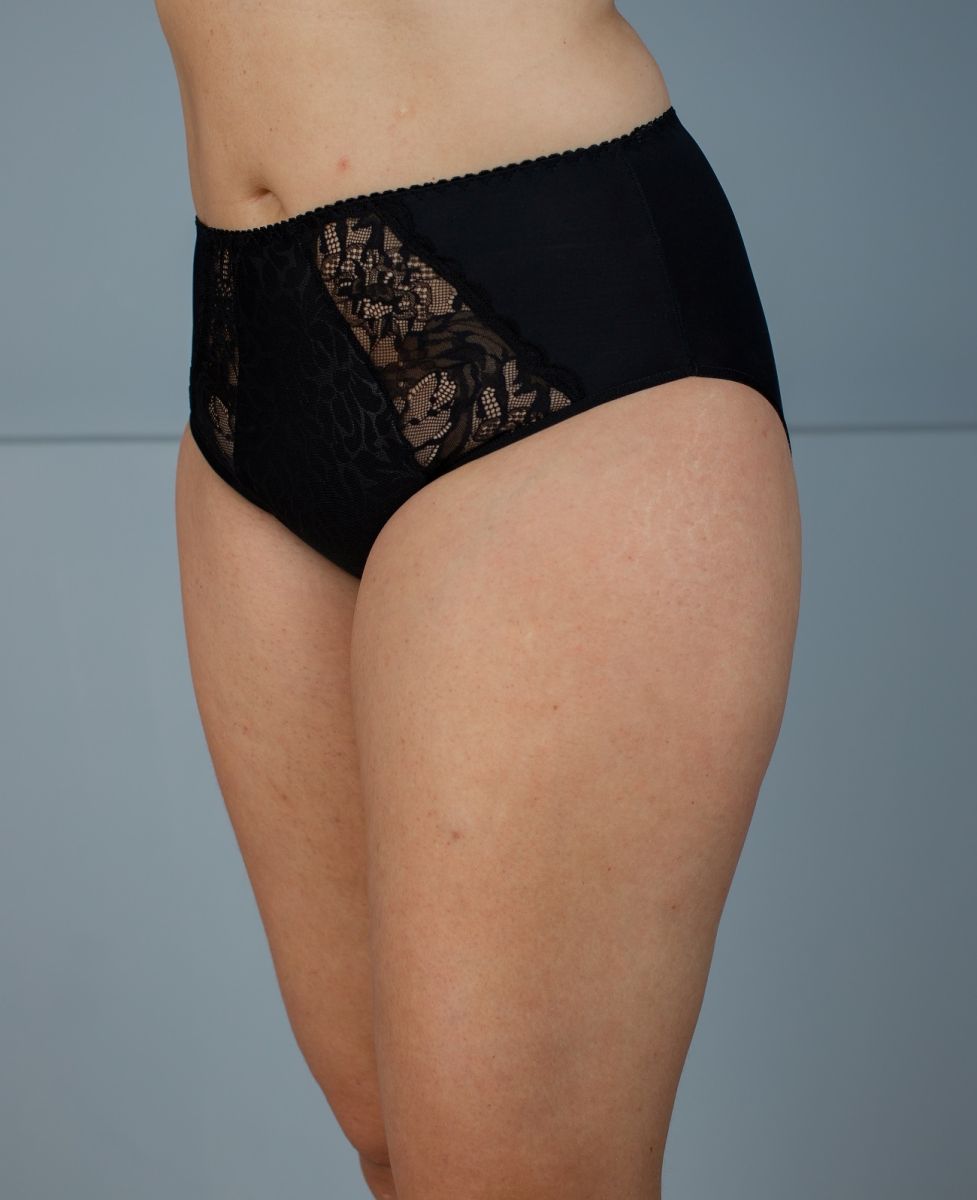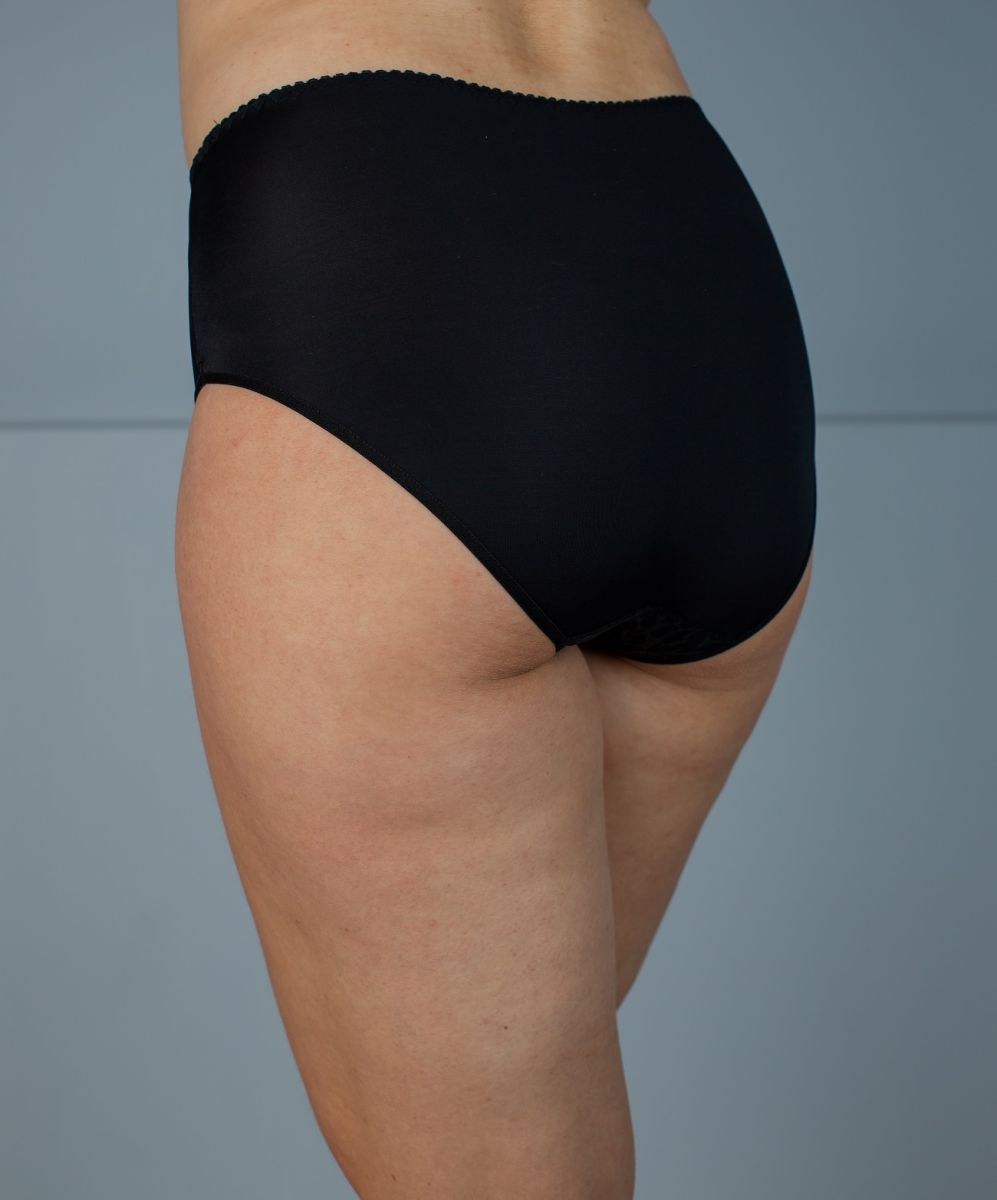 Трусы из эластичного полотна и эластичного кружева. Высокая посадка. Комплектуются к модели Б 320-5 Черный эмбоссинг.