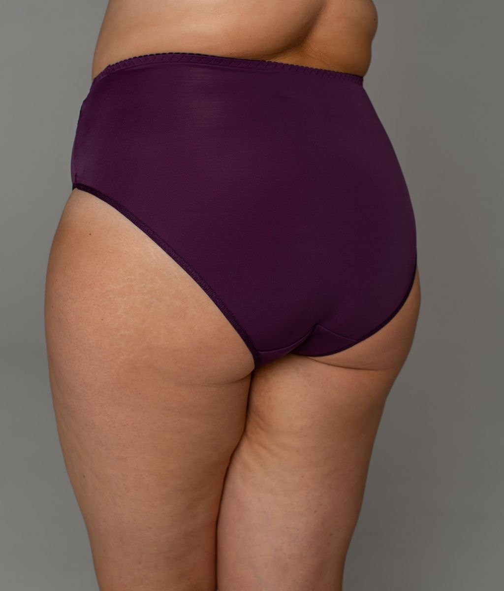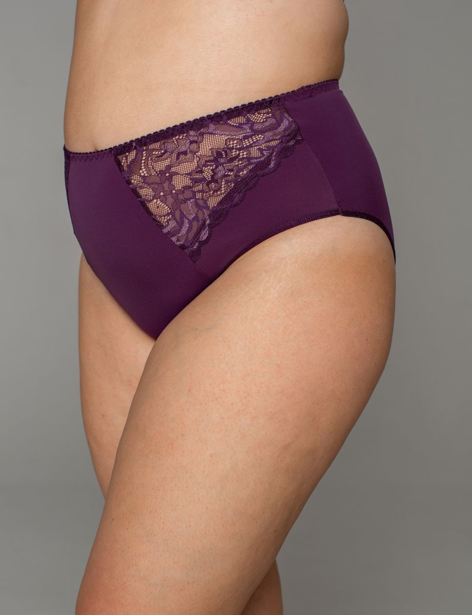 Трусы из эластичного полотна, эластичного кружева, с высокой линией талии. Отделка эластичной декоративной тесьмой.