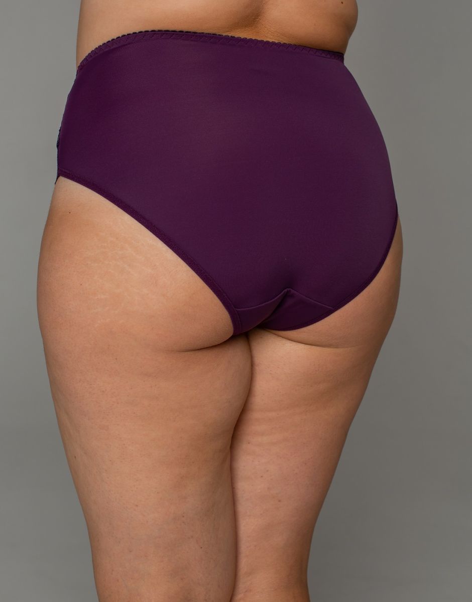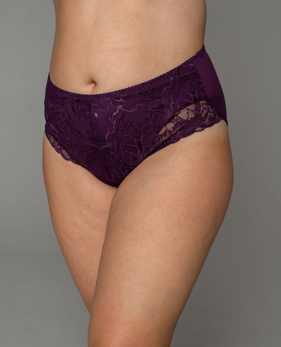Трусы из эластичного полотна, эластичного кружева, с высокой линией талии. Отделка эластичной декоративной тесьмой.
