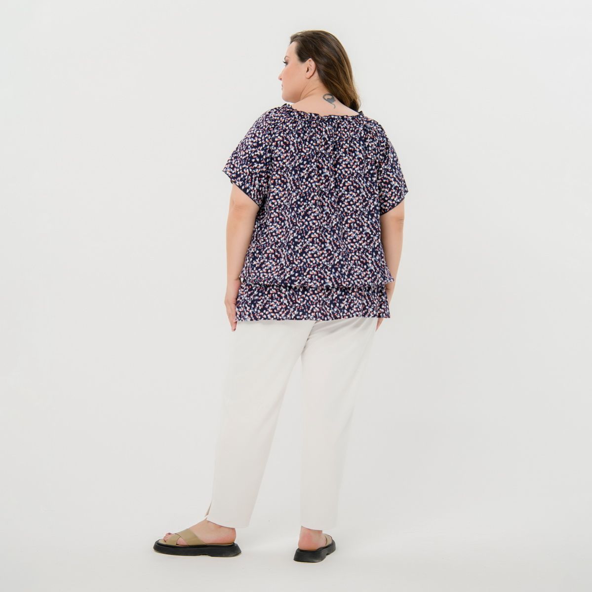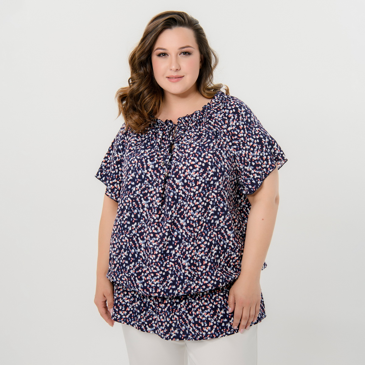 Туника из принтованого штапеля свободного силуэта. Рукав на основе реглан. Линия горловины расширена, на резиночке, за счет чего можно приоткрыть плечи. На уровне линии талии напуск, зафиксированный резинкой.