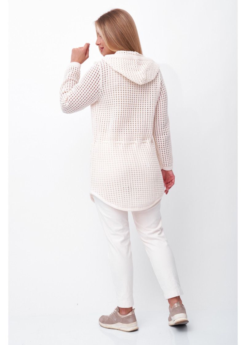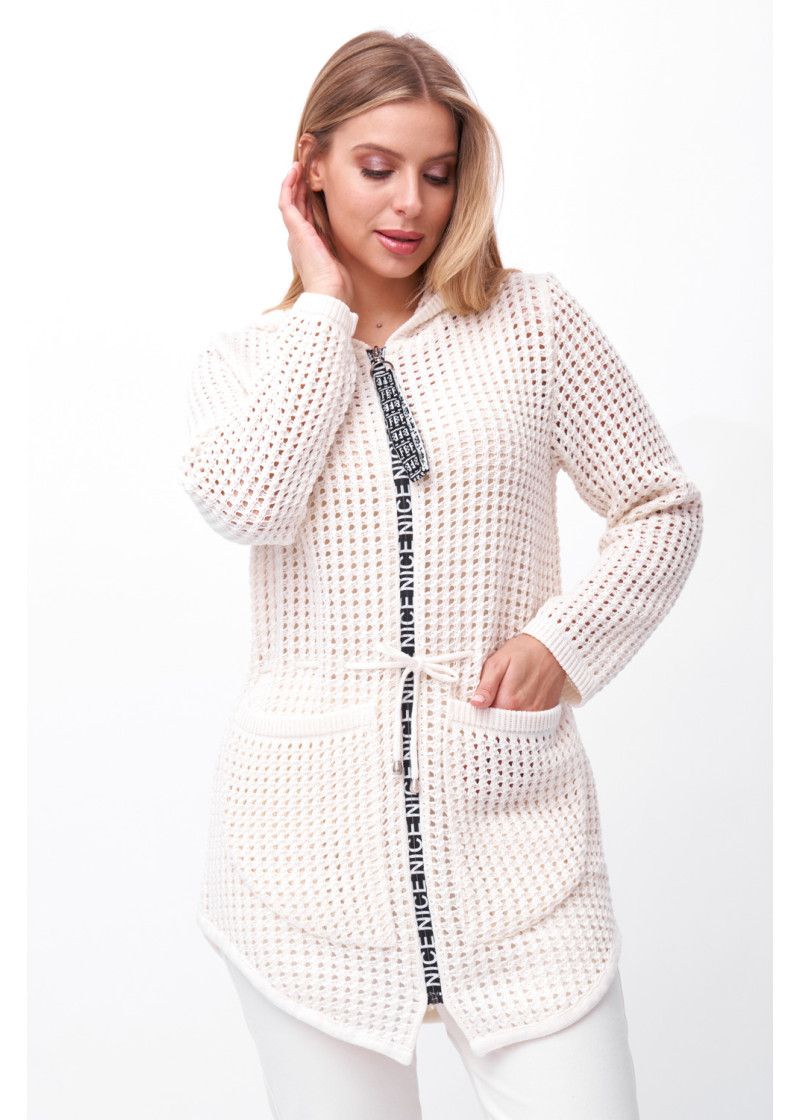 Женский вязаный кардиган с капюшоном, на молнии. Ажурный узор придает кардигану оригинальную легкость. Рукава втачные длинные. Накладные карманы.
