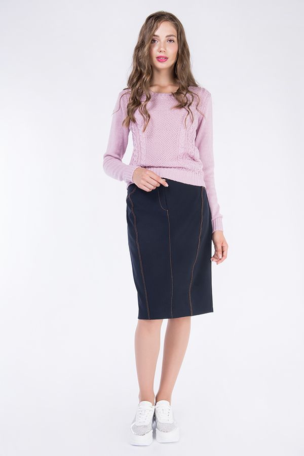 Юбка в джинсовом стиле, до середины колена, чуть приуженная, с рельефными отстрочками СИНЕГО цвета по передней и задней половинке. Спереди имитация карманов, гульфик, сзади кокетка, разрез.