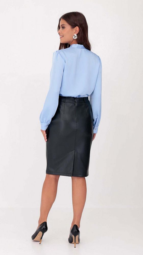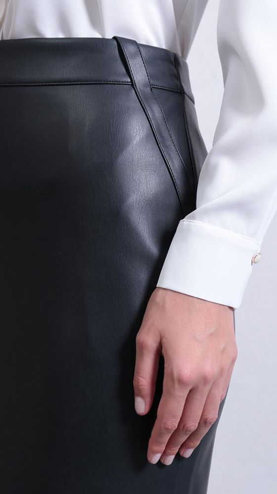 Юбка из экокожи зауженного кроя. По переду имитация карманов с декоративными планками. Застежка на потайную молнию. Изделие на подкладке. Для удобной носки предусмотрена шлица.