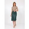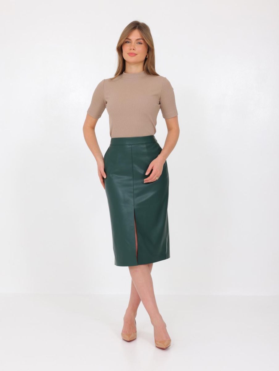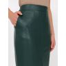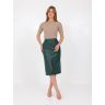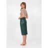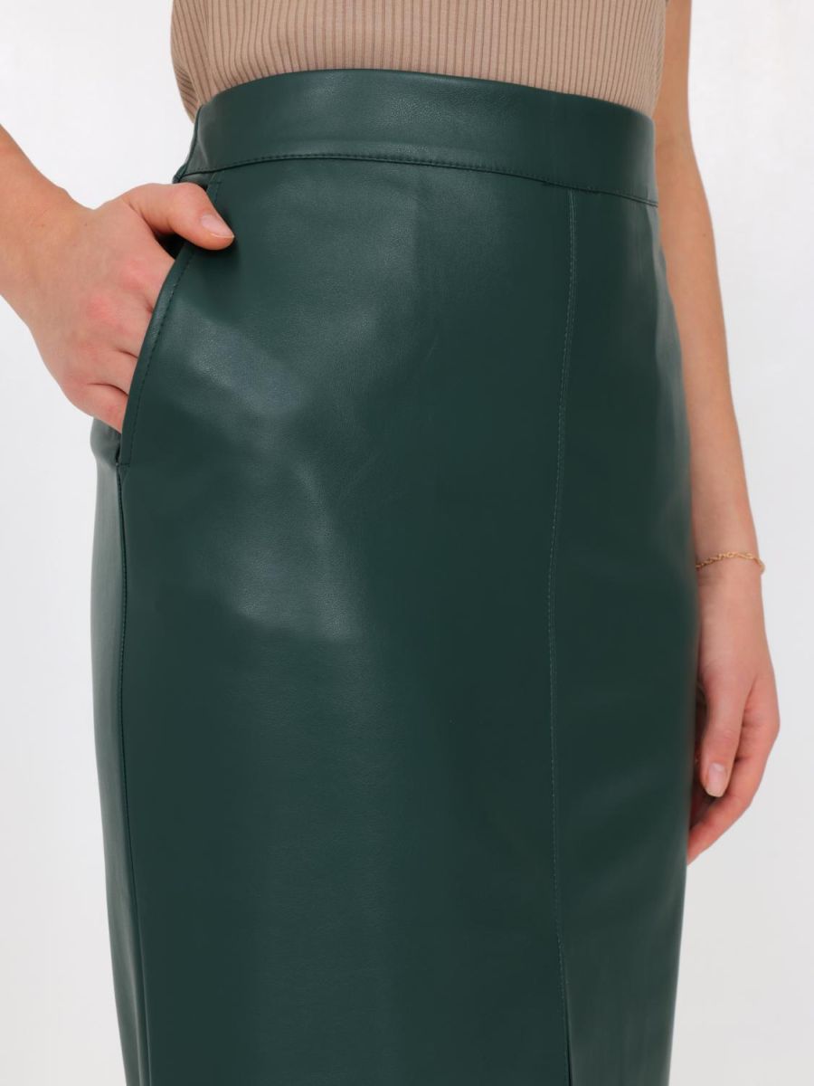 Посадка от талии. Силуэт-прямой. Спереди средний шов с разрезом. Сзади вытачки, декоративные карманы с листочками.